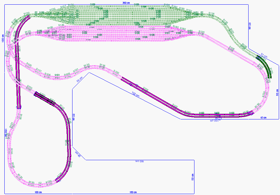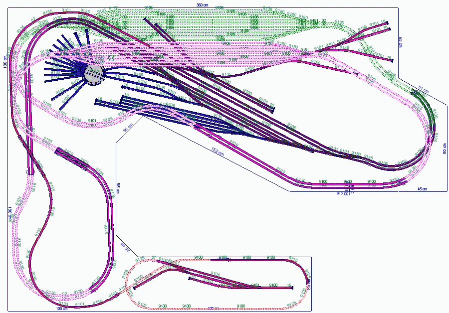 ... ich würde den grünen SBF weglassen und als Doppelspur anstelle des jetzigen rosa SBF verlegen. Dafür könnte der jetzige rosa SBF erweitert werden und an die tiefer liegende Stelle des ehemaligen grünen SBF rücken. Du hast dann mehr Bewegungsfreiheit falls mal was aufzugleisen ist.