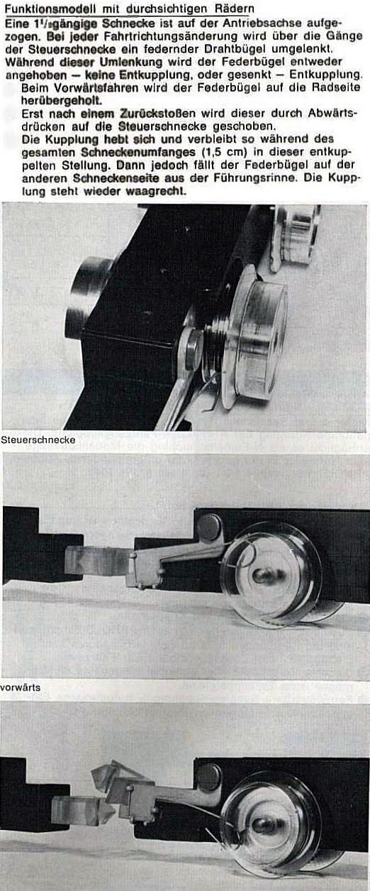 Ja, ich bin sicher. Die Wirkung kommt ja nicht von dem seitlichen Verschieben, sondern von der Änderung des Durchmessers der Schneckenwelle, also auf und ab des Bügels. Am Anfang und ende der Schnecke ist ein kleinerer Durchmesser in dem der Bügel "parkt", die Kupplung ist unten. Je nach Fahrtrichtung greift die Schnecke den Bügel und er läuft auf oder die Schnecke "schubst" den Bügel weg wie eine Schraube eine Mutter wenn sie schon ganz ab ist. Dies führt auch zu einem klickendem Geräusch.(Nachteil)