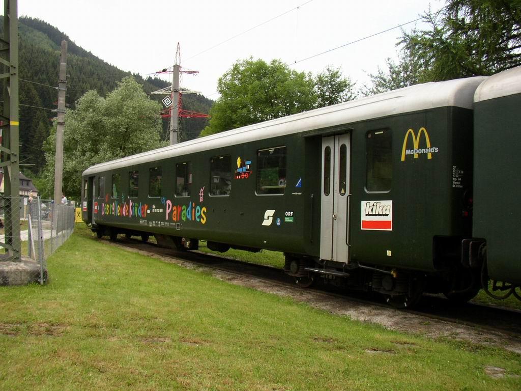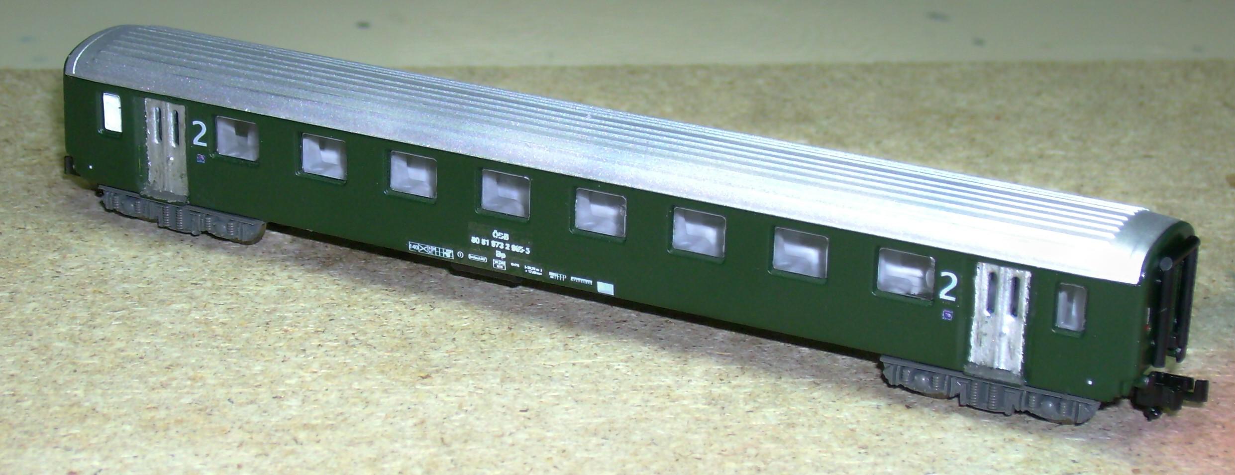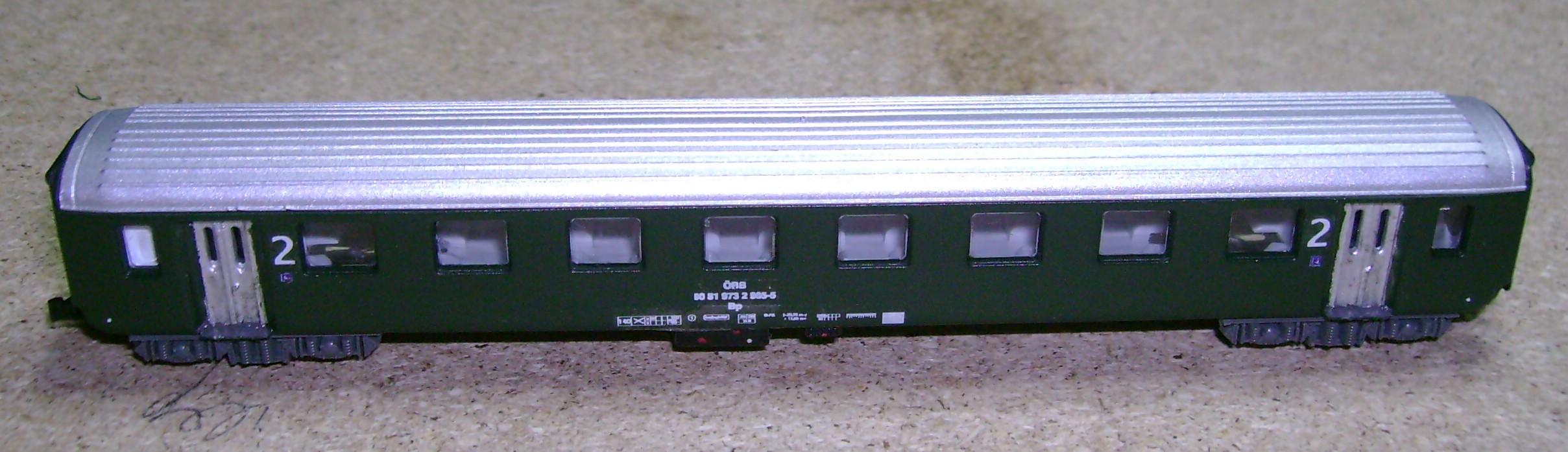 Dein wagen hat zentrierte Helvetica-beschriftung und große Frutiger-ziffern, wie sie erst seit ca. 2001 verwendet werden, wo es längst keine tannengrünen wagen mehr gibt (bzw. nur bei ÖBB-Nostalgie, wo sie diese beschriftung nicht erhalten).