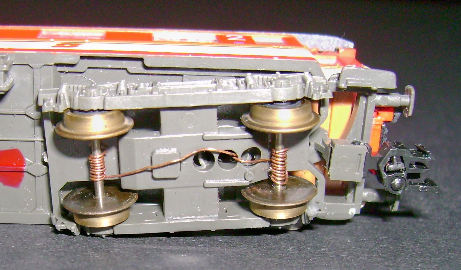 2. Der angelötete Draht an dem Stromschleifer der durch das einzige Loch an der DG Befestigung durchgezogen werden muss und ins Wageninnere gelangt, kann dazu führen, dass das DG schwer drehbar ist. Entgleisgefahr!