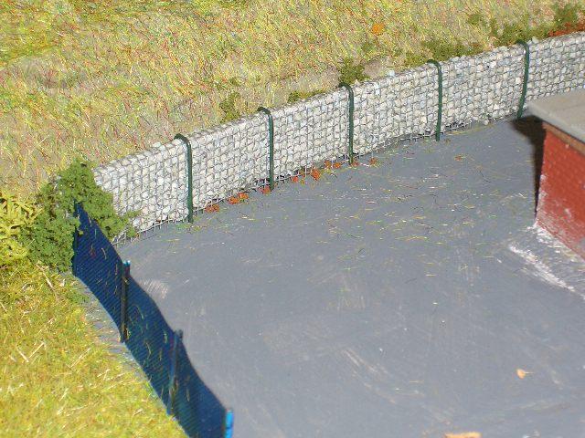 in der letzten Zeit sieht man häufiger Steinmauern, die mit einer Art Baustahlmatten zusammengehalten werden. Ich hab mal versucht, das aus Alu-Fliegendraht mit darübergeschobenen Klammern nachzubilden. Ich bin zufrieden mit meiner Arbeit.
