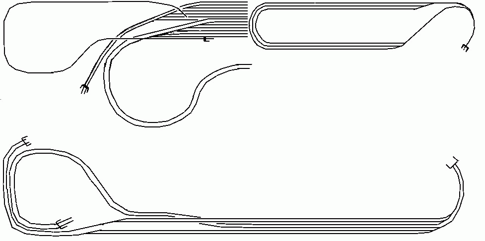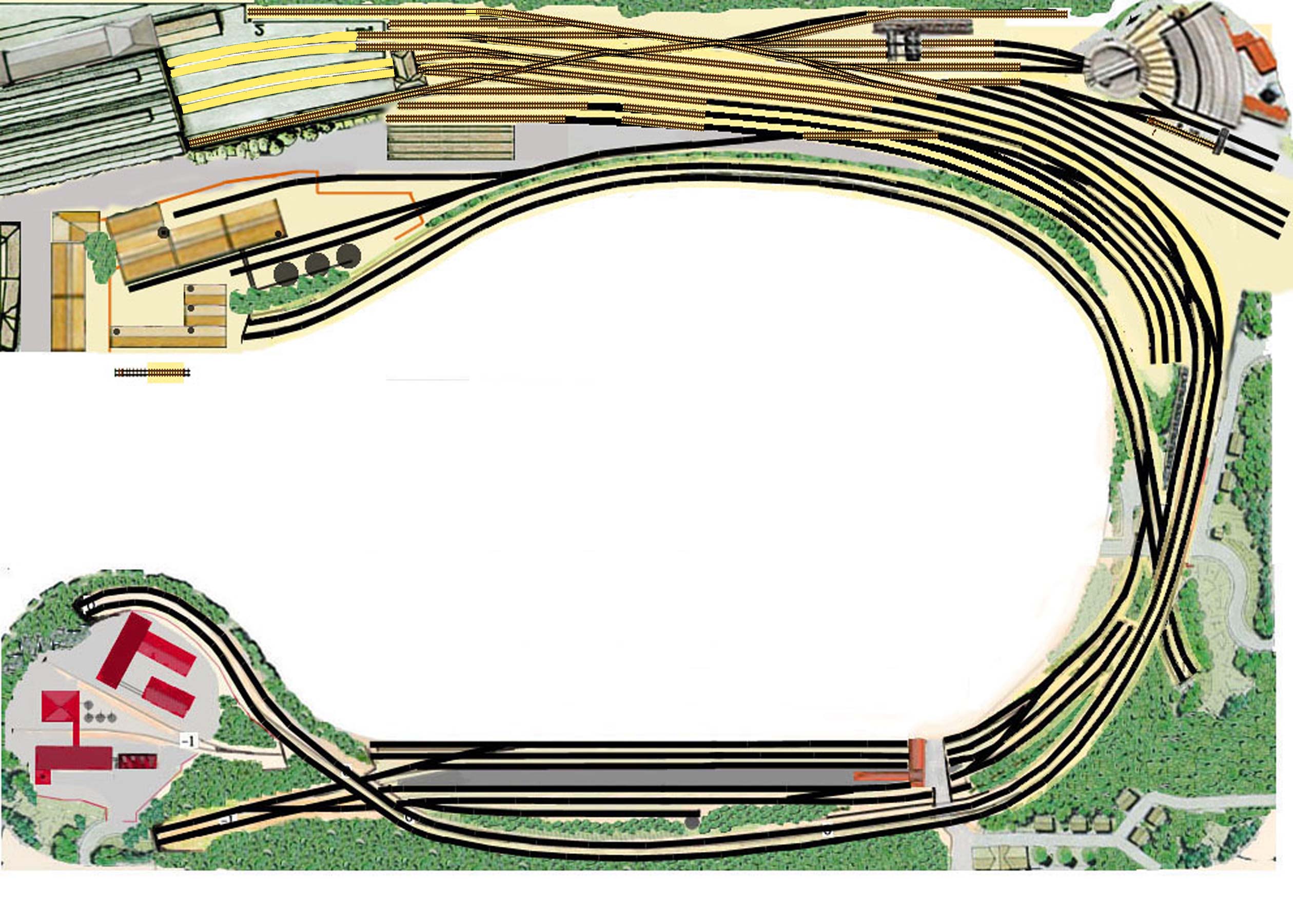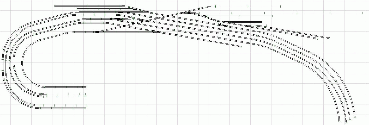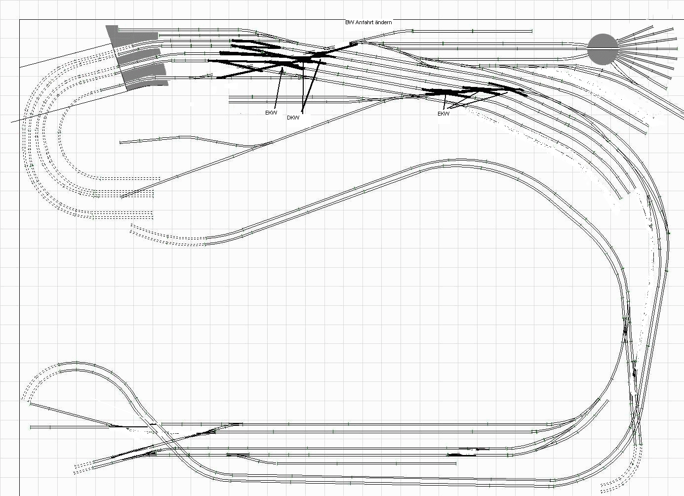 Langsam kommen wir den Wunschmaßen näher. Trotzdem: Ich würde den Bahnhof Nord in einer weitgestreckten Kurve auslaufen lassen und das östliche Bahnhofsvorfeld nach Süden ziehen. Die Bahnsteiggerade würde ich komplett durch einen langgestreckten Bogen ersetzen. Dann wird zwar die Paradestrecke etwas kürzer, aber es wirkt dann harmonischer. Dafür müßte das BW noch weiter nach unten gezogen werden. Die 180°-Kehre links unten würde ich großzügiger machen. Der Platz ist da, der Nebenbahnhof "Süd" ist wie auf Plan Version 1 ja eigentlich lang genug, um ein wenig beschnitten zu werden.