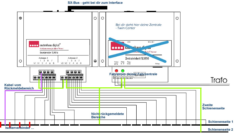 Du musst eine Schienenseite isolieren (am anfang und am ende der zurückgemeldeten Strecke). Dieses isolierte Schienenstück wird mit einem Kabel (anlöten an Gleis oder etwas fertiges vom Hersteller der Gleise) an den Rückmelder verbunden. Der Rückmelder wiederum wird zusätzlich noch mit einem Kabel an den Fahrstromausgang der Zentrale angeschlossen - und zwar an genau dem, der für diese Schienenseite vorgesehen ist.