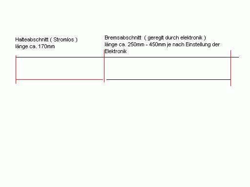 Im Schattenbahnhof mit 7 V Konstantspannung erwiesen sich Halteabschnitte 35-40cm als ausreichend. Auch bei Doppeltraktion.