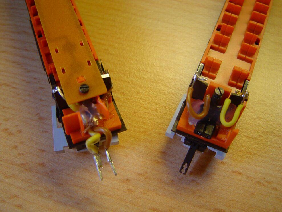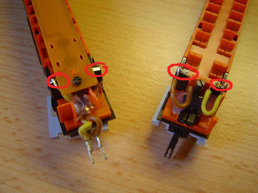 also ich habe das ausprobiert, aber sobald ich den Zug auch nur ein bisschen berühre, läuft er wieder weiter. Die rot markierten Kontakte habe ich nur aufgebogen und sie liegen jetzt fest an der Platine an.