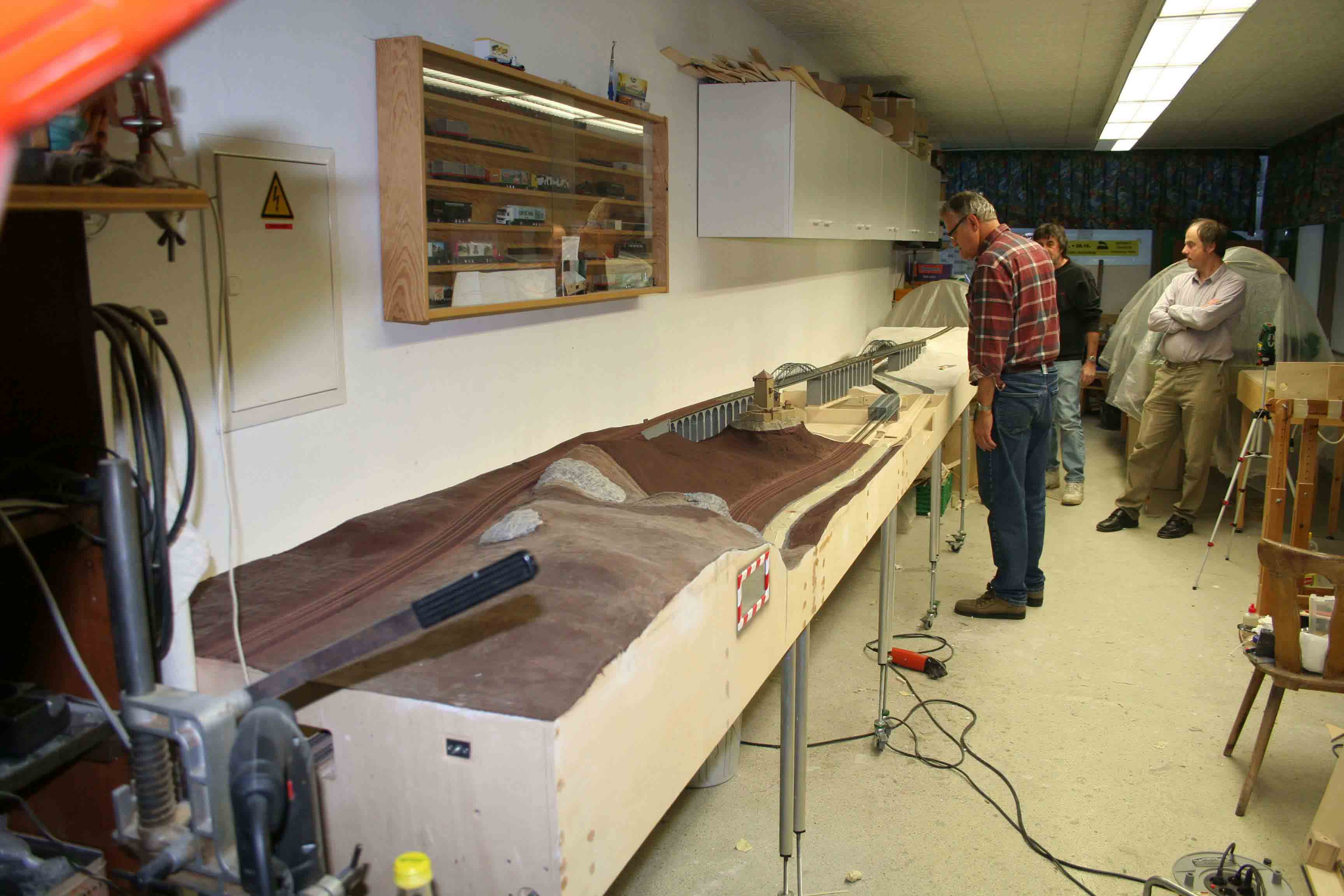 Das Foto hat eine für die Veröffentlichung im Internet sinnlos hohe Auflösung von 3456 x 2304 Pixel. Der grösste Teil zeigt zudem keine relevante Information, nur unscharfe Schraubzwingen, Kabelsalat, Abfall am Boden und diverse Werkstatteinrichtung. Der Focus (die grösste Schärfe) liegt auf den zwei Rollen vor dem Elektrowerkzeug am Boden und leider nicht auf der Modellbahn.
