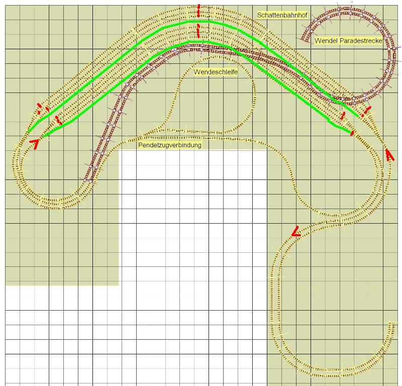 Pro Bogen sollen dann jeweils 2 Züge geparkt werden. Oben in der Mitte ist dann jeweils eine Isolierung und jeweils nach der Ein- bzw. vor der Ausfahrweiche, so dass die Gleise zum Nachrücken auch gleich lang sind.