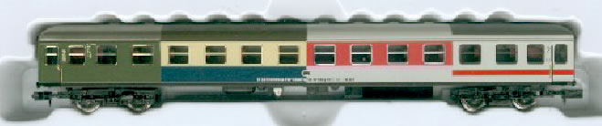 habe gerade den Minitrix Messewagen 2008 bekommen. Es handelt sich um einen 26,4m Personenwagen 2.Klasse mit der Wagennummer B4üm 18585 Esn in einer vierfach-Epochen-Lackierung: