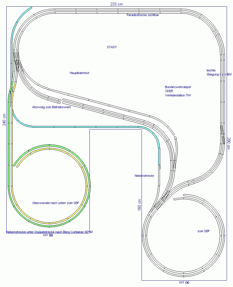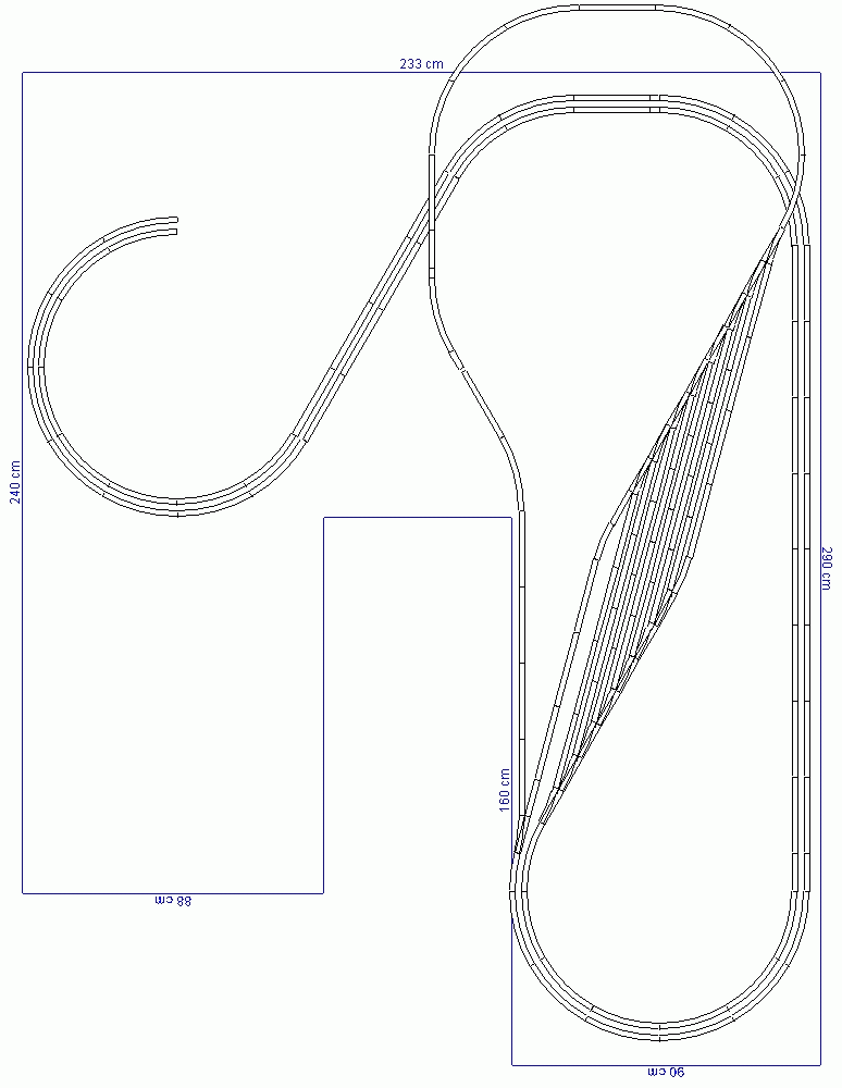So kannst du spielend mit 50 cm Anlagentiefe zwischen den Wendeln auskommen, nur die Wendeln selbst hätten mehr Anlagentiefe und für sanftere Gleisbögen könnten die Übergänge zwischen den Anlagenschenkeln abgeschrägt werden.
