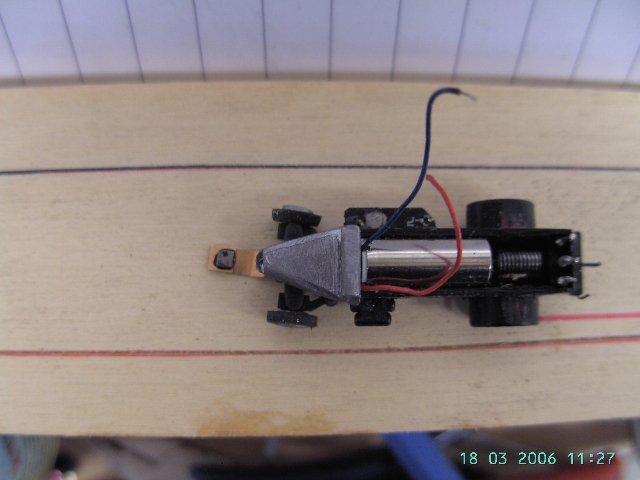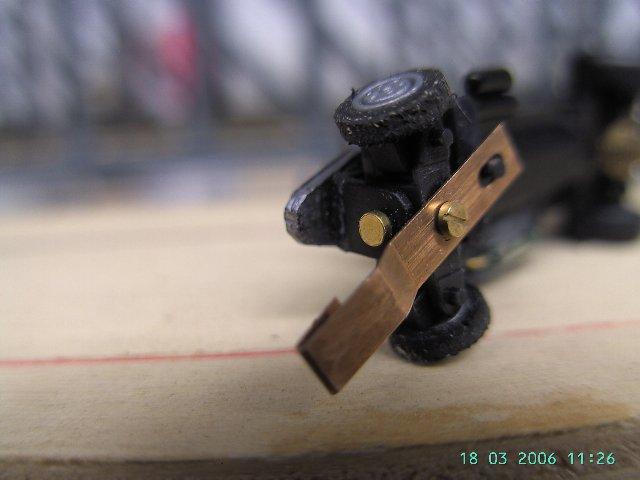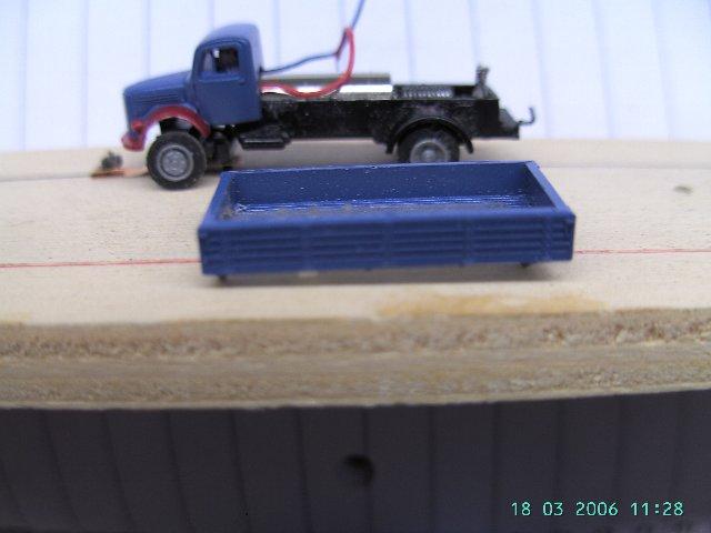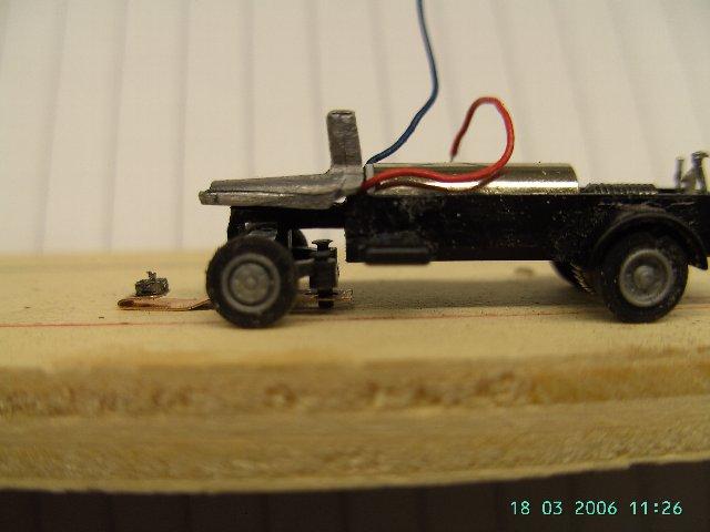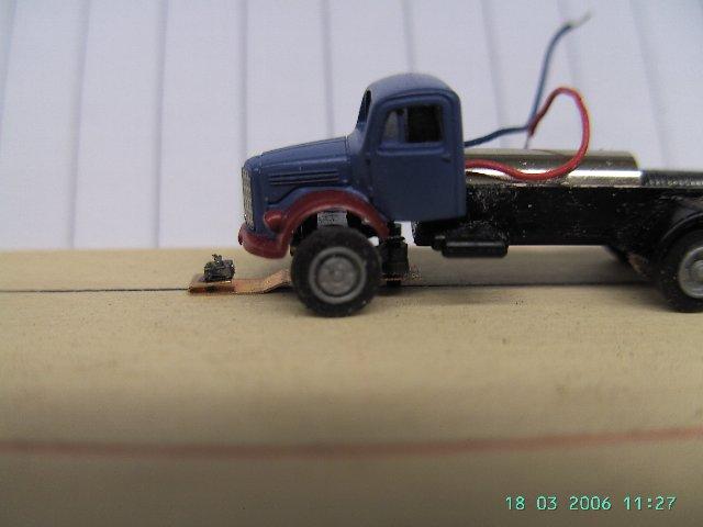 ist das Fahrwerk vom kurzen roten Faller MB, Radstand passt. Führerhaus, Pritsche,  Plane und Reedkontakt entfernt. Vorderachse in der Spurweite verringert (ca 0,4mm), Vorderrad Bolzen gekürzt, um das Spiel zwischen Rad und Achsschenkel zu verringern, Reifen im Durchmesser kleiner geschliffen.