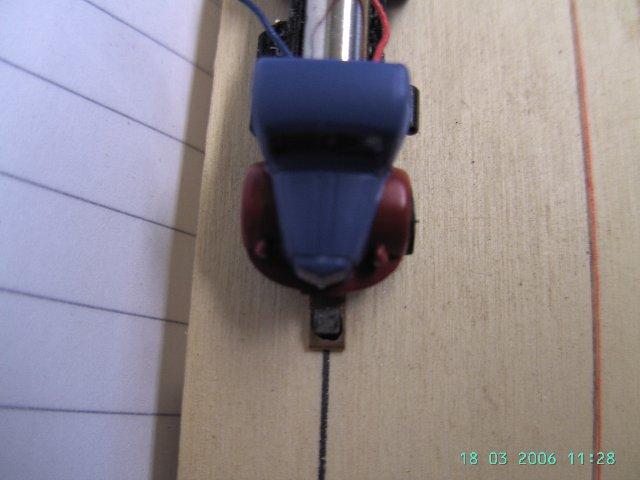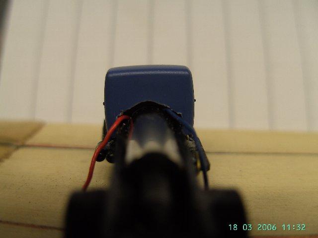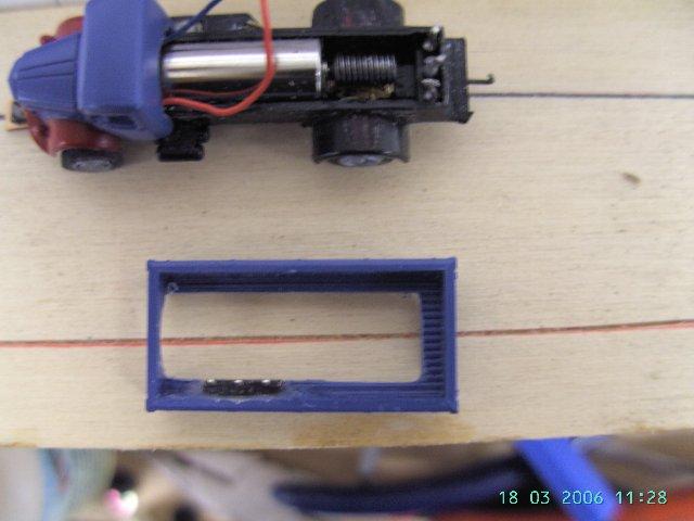 Fahrwerk vom Faller Bus, Reedkonakt ausgebaut, vorne direkt nach dem Motor , hinten direkt nach der Ladebuchse abgeschnitten (Hinterachse muss in den RAdlauf passen). Beidseitig bischen abgefeilt, Reedkontakt ca. bündig mit Vorderkante des Motor wieder eingebaut- Antrieb fertig.