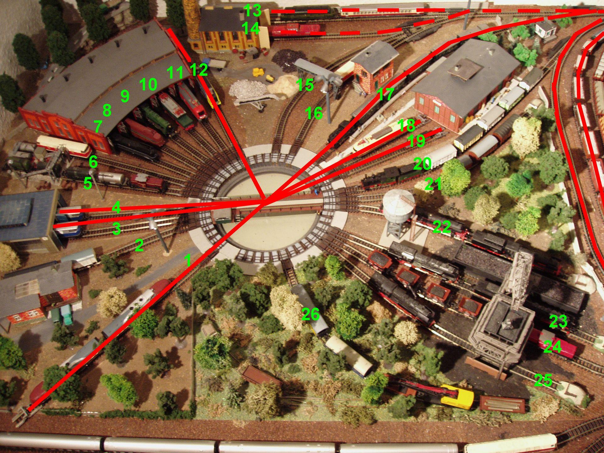 Du must immer über der Drehscheibe zu den "Oberleitungsgleisen"