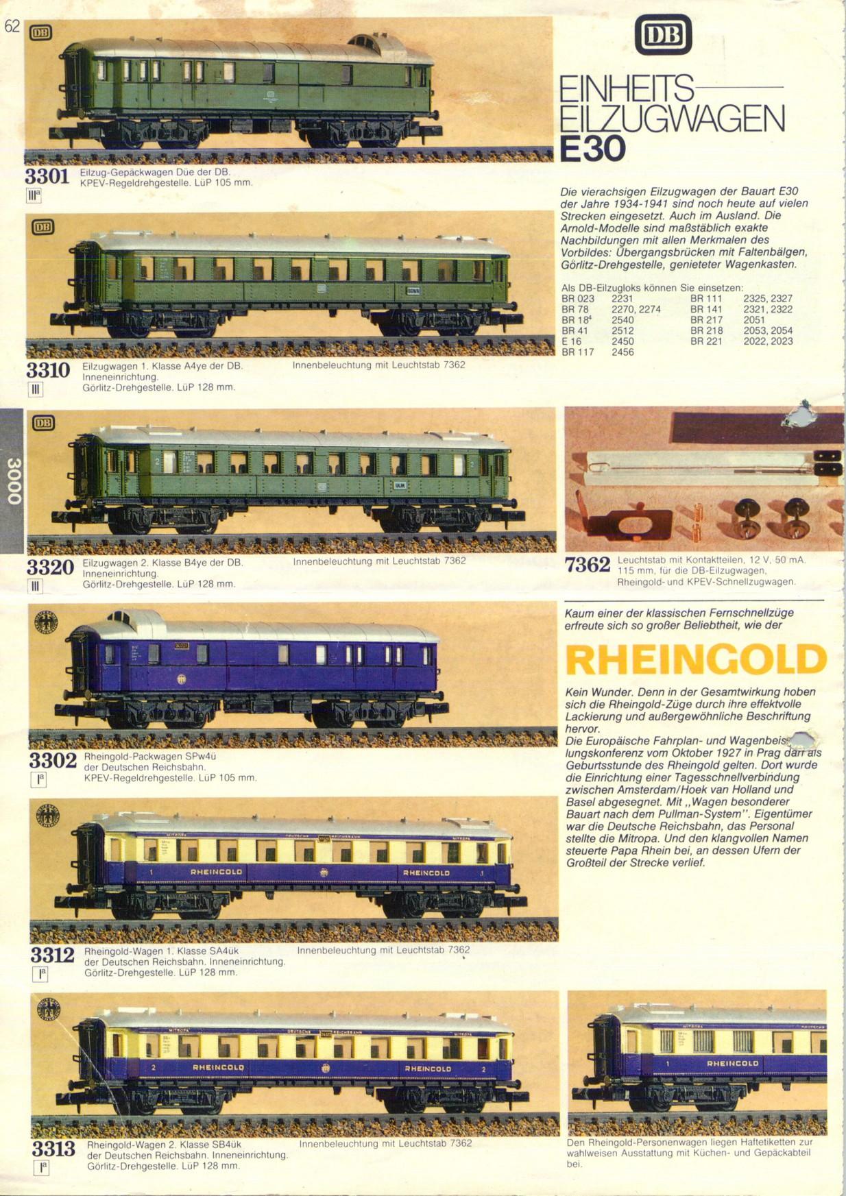 Ich besitze die Rheingoldwagen aus dem Set 0143 (Produktion ?). Diese Wagen haben sämtlich exakt die gleiche Höhe. Was mich wundert, ist, dass die Wagen eine Länge von 146 mm haben. In meinen alten Arnold-Katalogen werden die Wagen aber nur mit einer Länge von 128 mm angegeben. Gab es da später mal neue Formen?