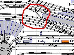 Es ist jetzt vom Gleismitte zu Gleismitte ein Abstand von 75 mm. Wenn ich die 23 mm entsprechend der Norm abziehe, wären nur noch 52 mm geblieben. Das hätte tatsächlich nicht gut ausgesehen. Wenn ich jetzt ändere habe ich nur das Problem, die Ausfahrweichen im Westen - also nach links - in die Kurve verlegen zu müssen. Bogenweichen haben aber maximal R3 und R4 und ich will im sichtbaren Bereich mit R5/R6 fahren. Ich habe mal an Hand eines Ausschnittes angefangen umzuplanen