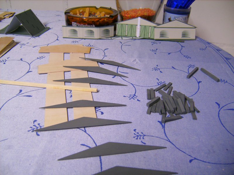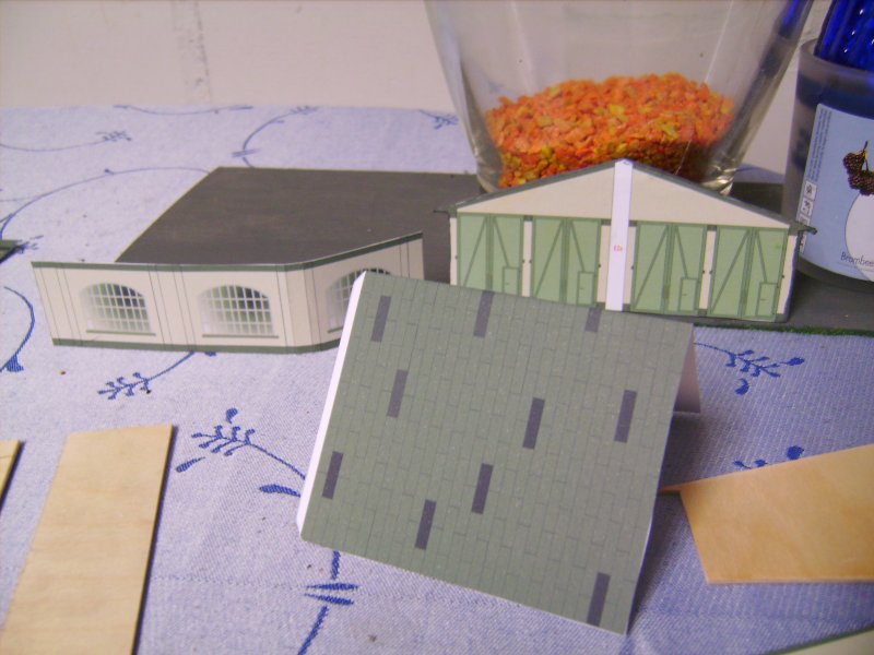 Echtfenstern und Echtoren konnten Aufgrund der noch nicht eingetroffenen Teile von Schiffer Design bis jetzt leider nicht angefertigt werden. Dass Dach wird noch etwas verbessert werden und die Grundplatte erhält natürlich auch noch Gleise Bilder von den Grundteilen der Wände siehe weiter oben, wurde schon gepostet....