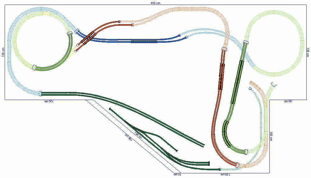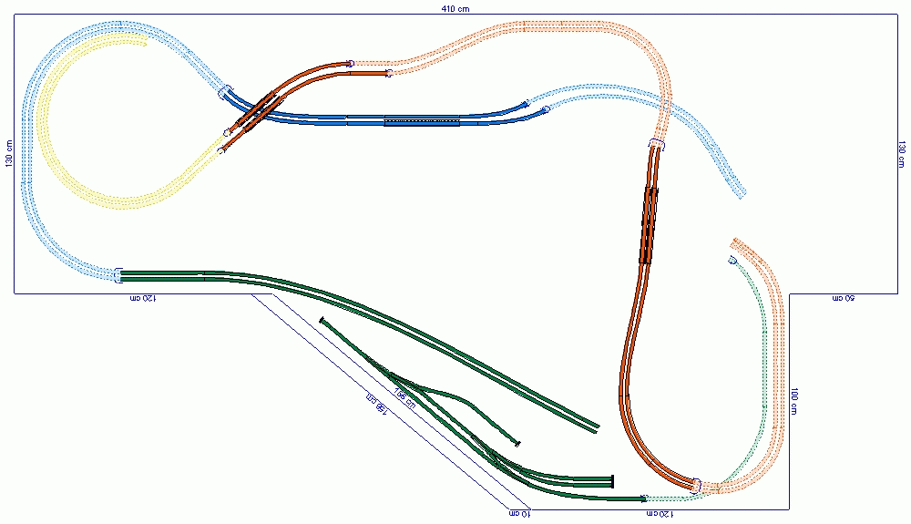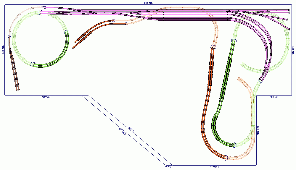 Meine Überlegung war, ob ich die Sbf's als Durchgang oder besser als Kehrschleifenbahnhöfe anlegen soll. Bei letzterem würde ich - bedingt durch die längeren Bahnhofsgleise - weniger Weichen benötigen, da ich die Züge hintereinander unterbringen könnte.