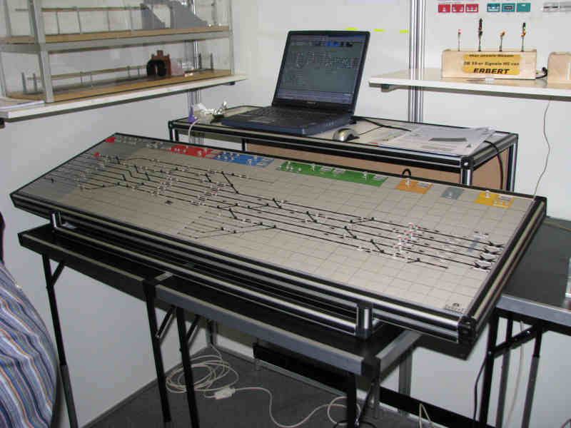 Ich selbst fahre zur Zeit erst einmal mit einem Bildschirmstellwerk auf einem 24"-Monitor, der so im Stelltisch montiert ist, dass er die Sicht auf die Modellbahn nicht verstellt. Und ob ich nun bei einer Bedienungshandlung kurz auf die Taster schaue oder auf den Monitor, kommt auf dasselbe heraus. Dennoch ist die Idee mit dem Erbert-Tisch noch nicht gestorben, erst recht nicht, seit ich ihn nun in natura für einen echten Einsatz und nicht nur als Demo-Spielzeug auf der Kölner Messe gesehen habe.