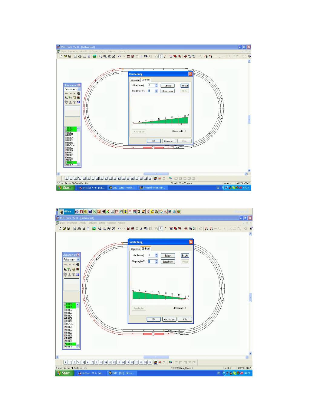 links von der Weiche setzt du die Steigung auf -2%, dann wird auch für die Weiche der Höhenwert -X übernommen. Dann rechts von der Weiche im 3D-Profil Steigung 2% eingeben, das Profil wird dann sofort geändert. Wie bereits beschrieben kannst du dann die Höhenachsen individuell bearbeiten.