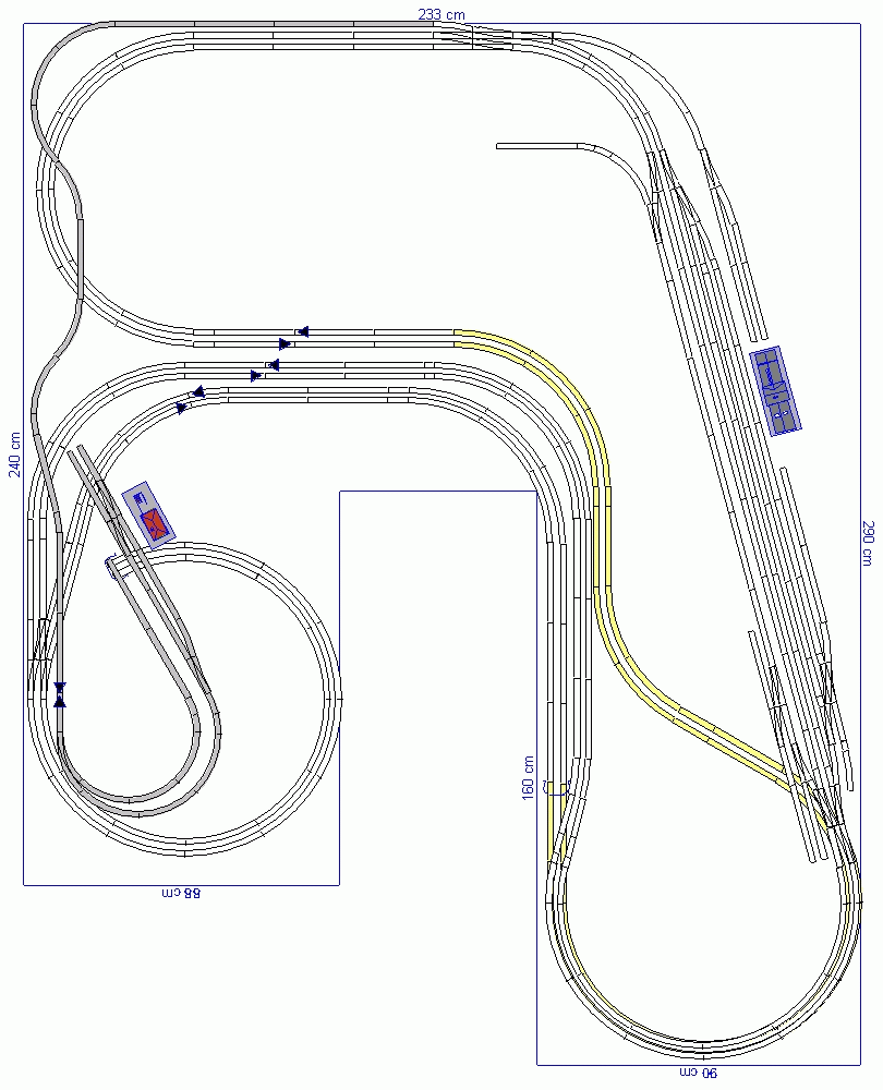 ich würde den Anfangspunkt erst mal auf die Weiche rechts setzen (Höhe 0), und dann gegenüber mal eine Brücke mit Höhe X. für Steigung 2%. Dann hast du im Höhenprofil einen Überblick. Jetzt musst du "nur" mit der gedrückten linken Maustaste von der Höhenachse 0 auf die Höhenachse X ziehen und dann berechnen lassen, und dann wieder zurück zum Ausgangspunkt 0. Oder so, hab ich jetzt ausm Stegreif beschrieben. Wenns nicht klar wurde, vielleicht heutabend am Rechner. Nach Anleitung Schritt für Schritt hilft auch, so hab ich es gelernt.