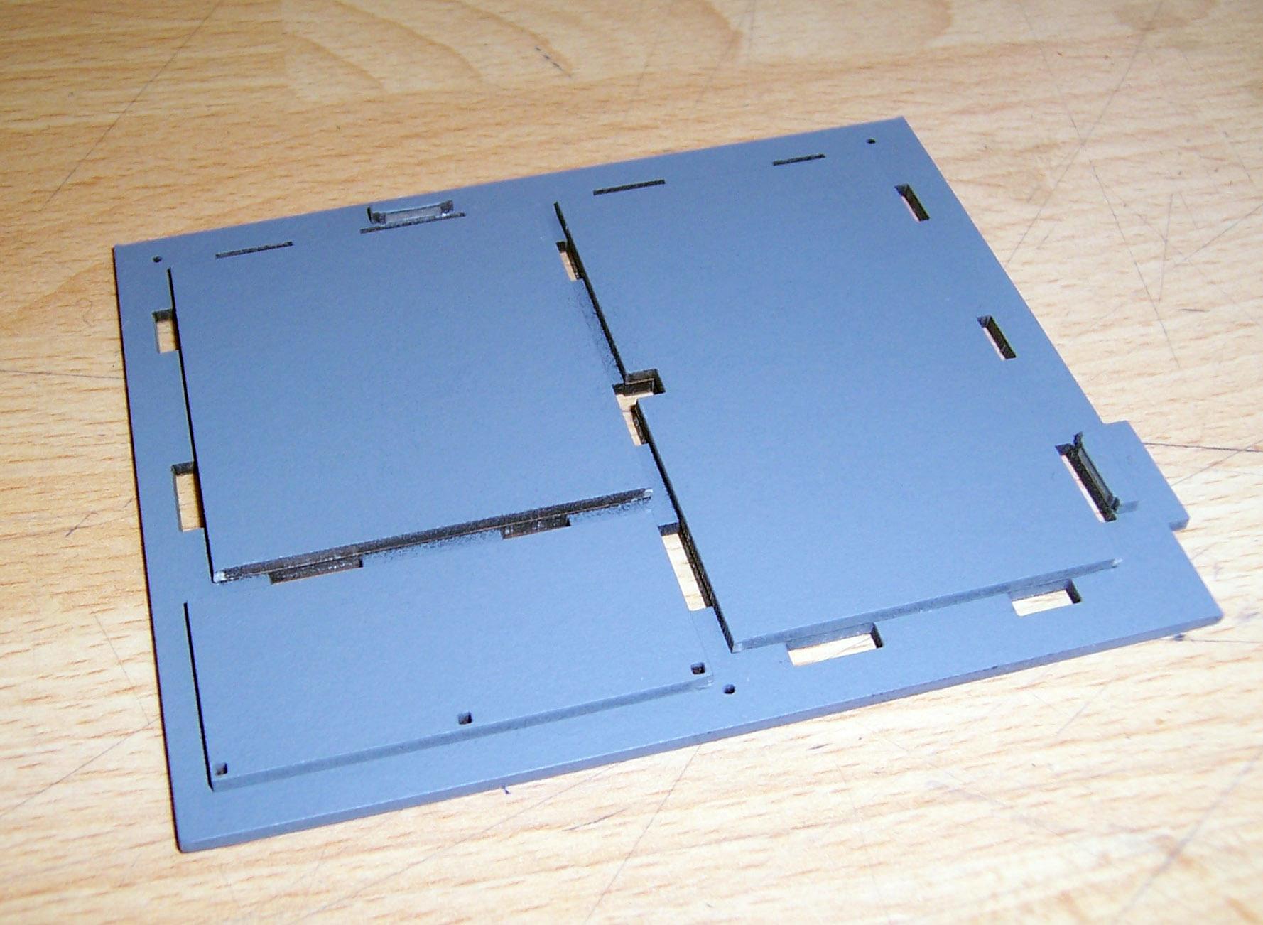 Horia hat den Grundriss und die Ansichten, wie in der Architektur üblich, gezeichnet und ich habe daraus eine Zeichnung erstellt mit der man den Karton lasern kann und Stefan Teichert hat es dann gelasert.