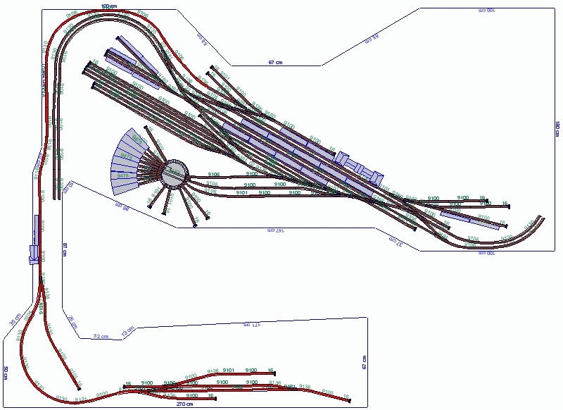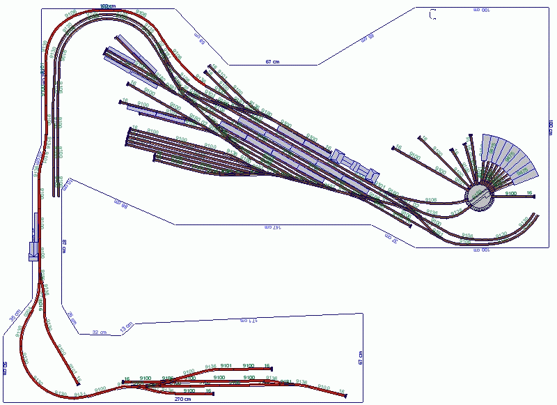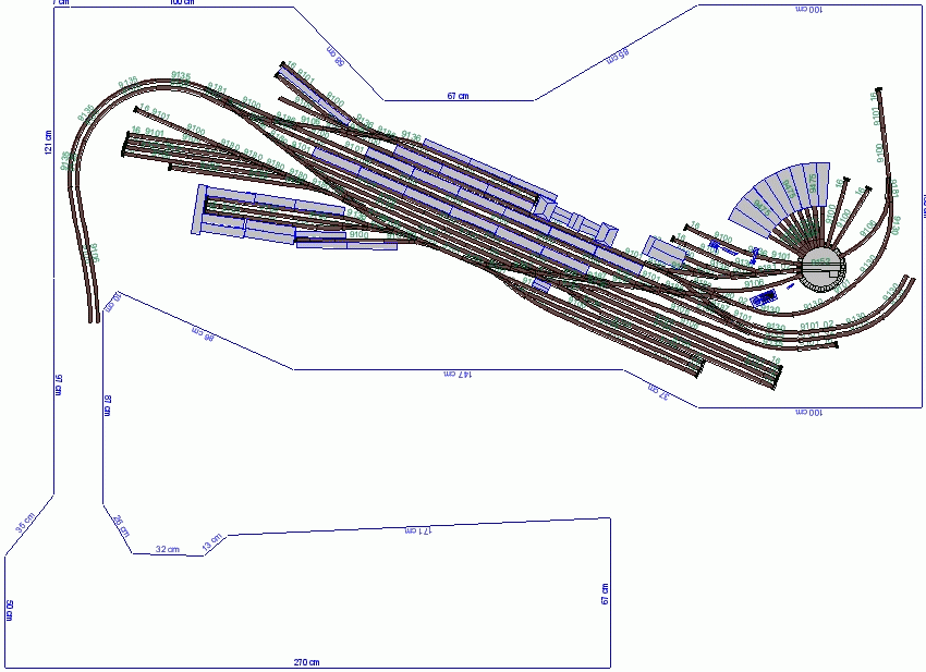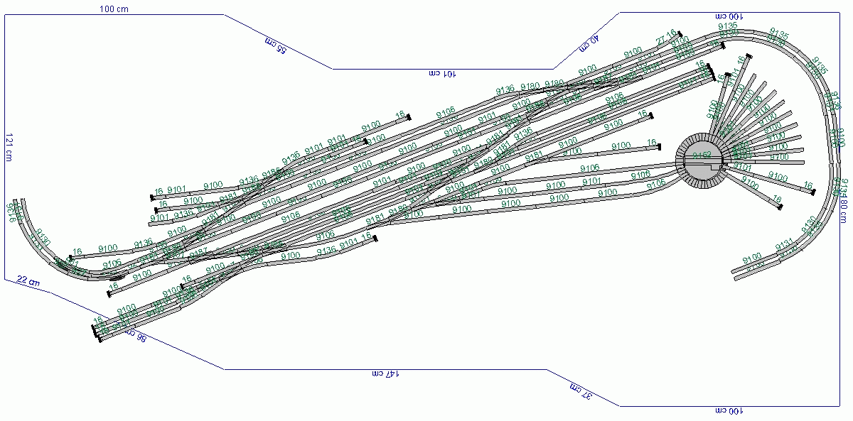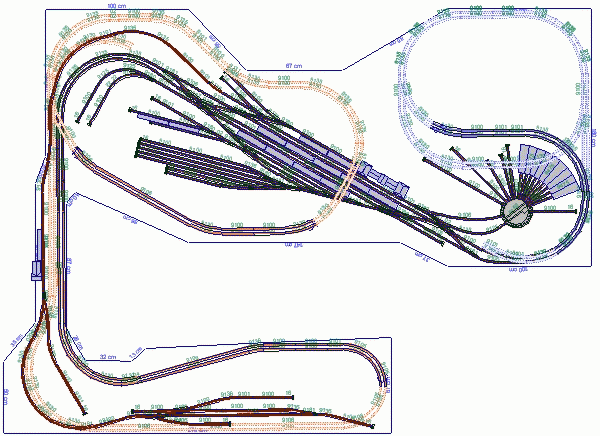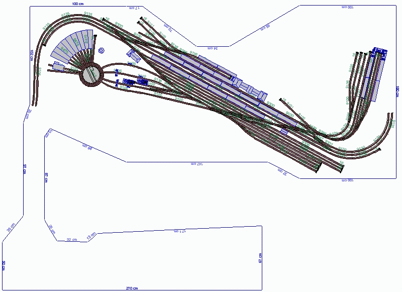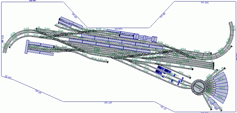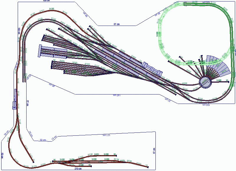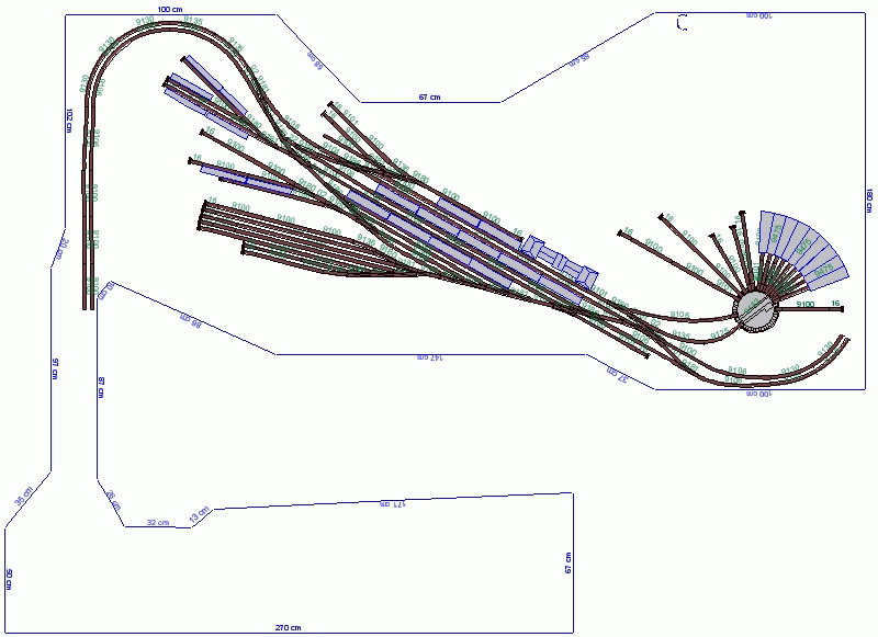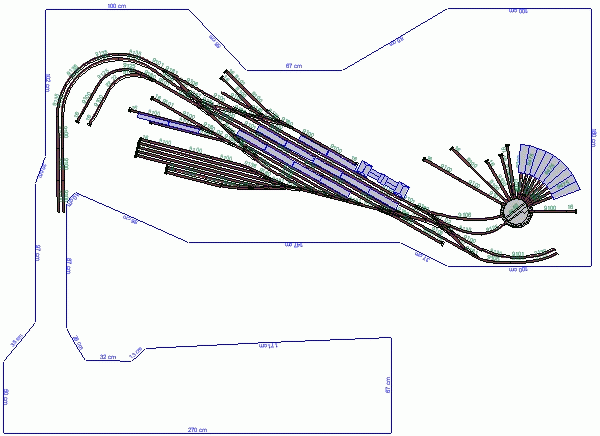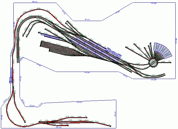 mir scheint es für die Nutzbare Fläche zuviel Bahnhof und zuwenig Strecke zu sein. Zudem sehe ich ein weiteres Problem. Im unteren Schenckel hats Du max. 67cm für eine Kreisdurchmesser. Das ergibt einen realisierbaren Radius vin knapp 30 cm, also weniger als R3. Für Züge mit 160cm etwas unpraktisch.