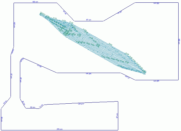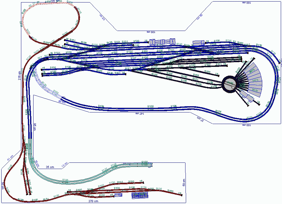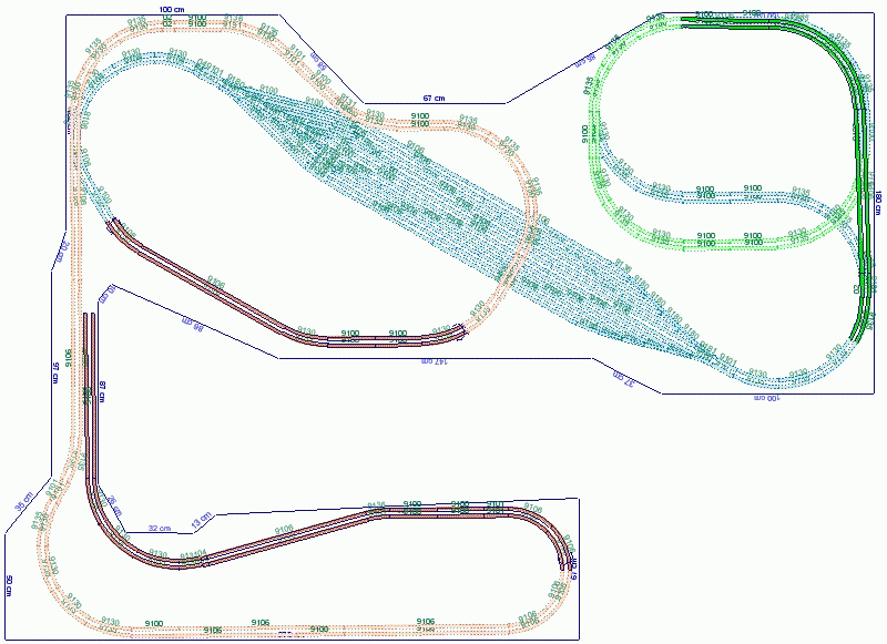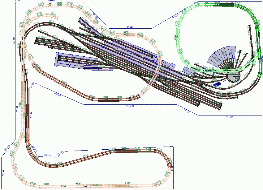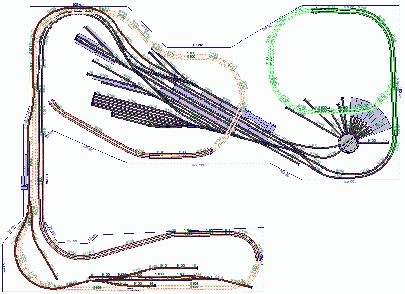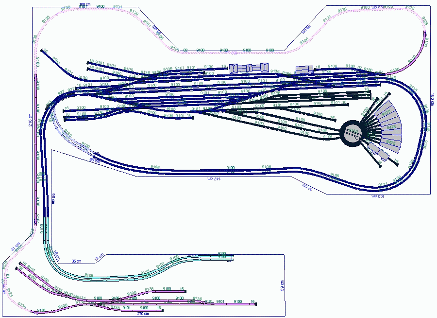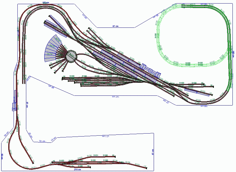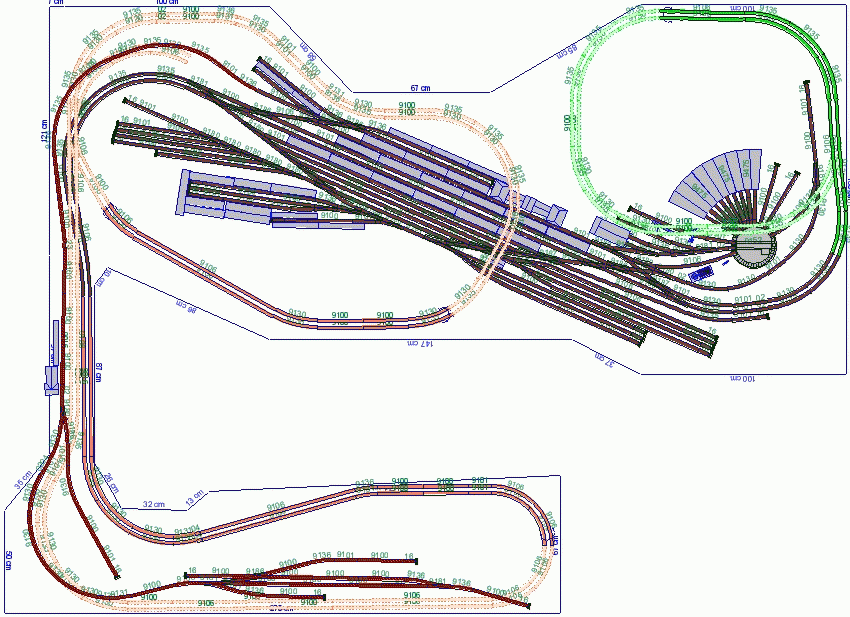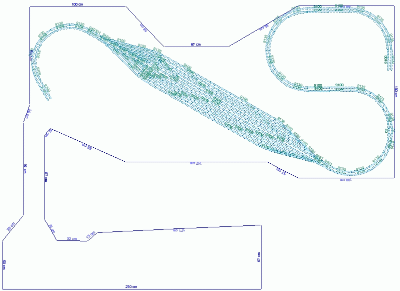 mir scheint es für die Nutzbare Fläche zuviel Bahnhof und zuwenig Strecke zu sein. Zudem sehe ich ein weiteres Problem. Im unteren Schenckel hats Du max. 67cm für eine Kreisdurchmesser. Das ergibt einen realisierbaren Radius vin knapp 30 cm, also weniger als R3. Für Züge mit 160cm etwas unpraktisch.