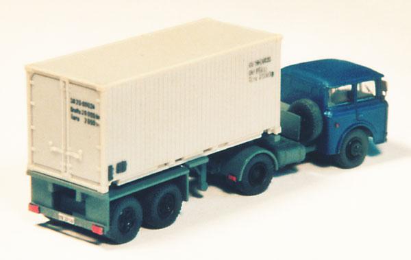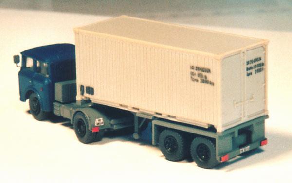 Auch dazu gibt es eine kleine Geschichte. Der generelle Umbau erfolgte mal wieder damals ungefähr in der Wendezeit. Als Vorbild diente das entspr. HO-Modell. Der Rahmen des Kippers wurde gekürzt, die Schutzbleche der Pritsche angebracht und diese typische Aufliegeraufnahme mit der geschlitzten Platte nachgebildet. Der Auflieger wurde komplett aus zurechtgefeilten Profilen auggebaut. Der Container stammt von Piko.