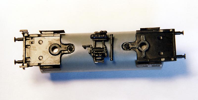 Ein Piko-Kesselwagenuntergestell habe ich zersägt, auf jeder Seite 25 mm von der Pufferbohlenvorderkante weg. Dann habe ich die Teile so bearbeitet, daß die Seitenwangen des Rahmens eine Länge von 17,5 mm haben und mittig einen 4 mm breiten Steg gelassen, damit das Loch für die Aufnahme der Zapfen (dient der Verbindung Kessel/Untergestell) des Kessels erhalten bleibt.