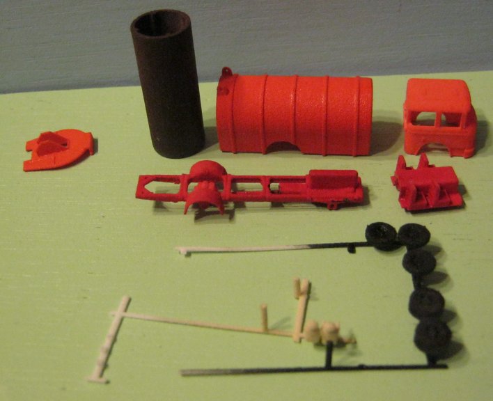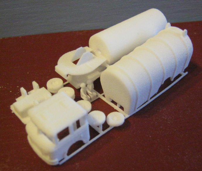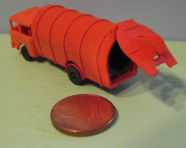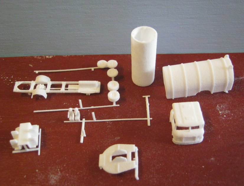 Die Teile werden noch einmal neu angeordnet und Kabine sowie Aufbau und Kleinteile  in FUD oder FXD bei Shapways gemacht,  Inneneinrichtung und Rahmen werde ich wohl in Leipzig machen lassen denn das muß ja nicht so glatt sein.