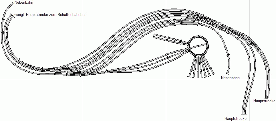 Von den Nebenstrecken kommst Du nur in ein durchgehendes Gleis des Bahnhofs, wenn es danach auf eine der Hauptstrecken gehen soll, das heisst, dass Du nicht kreuzen kannst, wenn ein andere Zug von der Hauptstrecke auf die Nebenbahn möchte. Das hätte zur Folge, dass der Zug auf der freien Strecke vor dem Bahnhof warten müsste, bis der andere Zug gefahren ist, damit blockierst Du alles. Ich würde Dir raten, die Nebenstrecken ein Gleis höher anzuschließen, dann wäre das möglich.