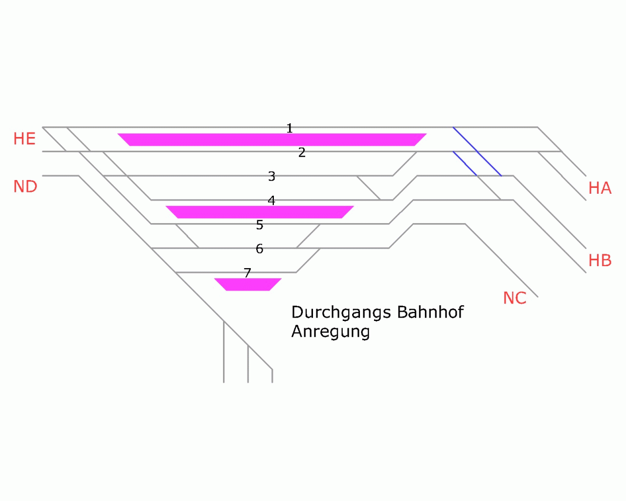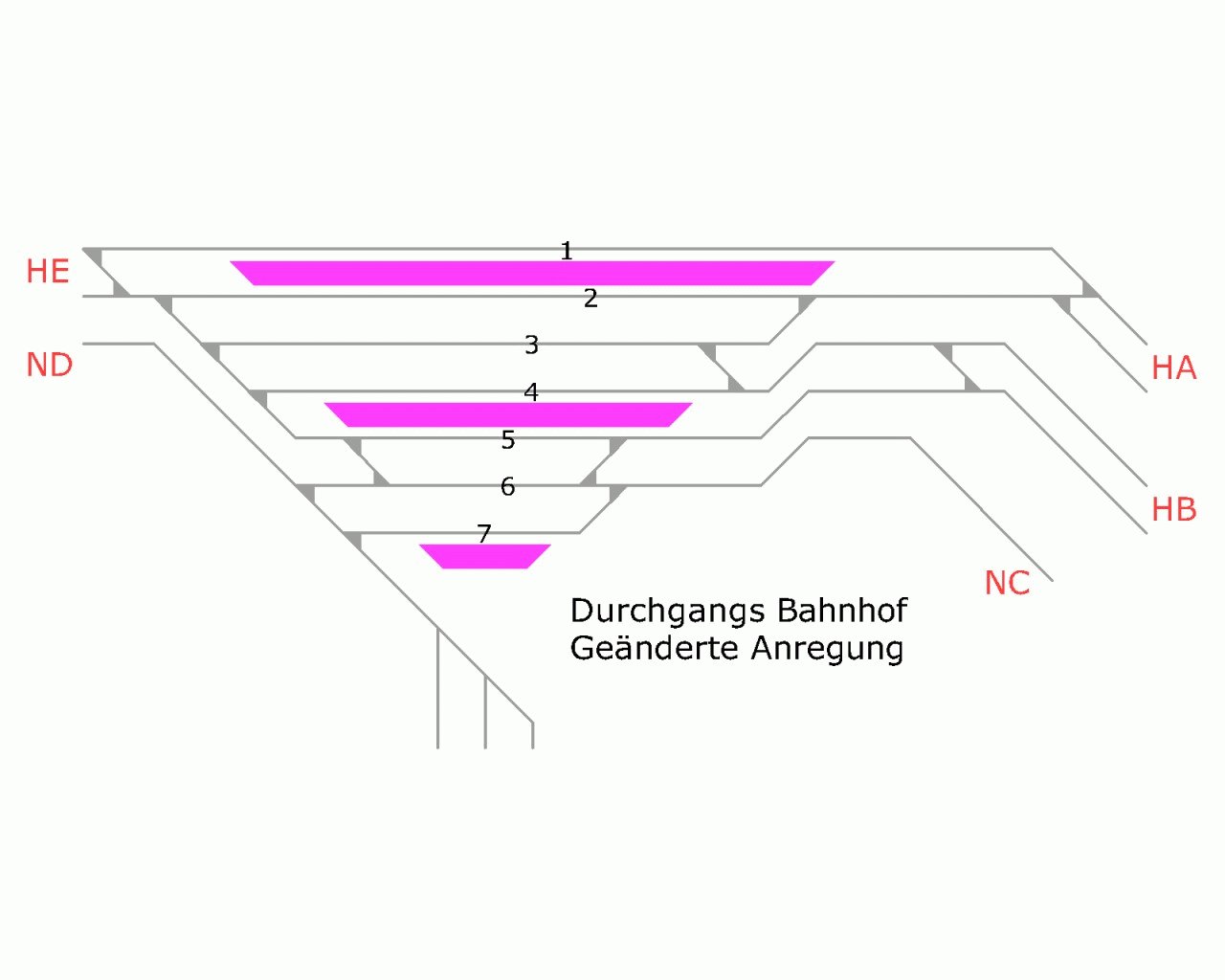 leider war ich einige Zeit vom Netz abgekoppelt (Virus) und habe die Zeit genutzt, um meinen Bahnhofsentwurf etwas zu modifizieren (danke für die Anregungen!!!). Vielleicht kann der Betrieb jetzt etwas fließender gestaltet werden: