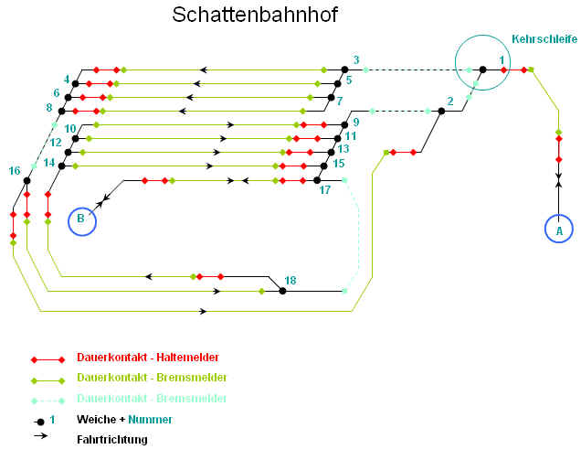 Ich habe nach der letzten Weiche zum Schattengleis zwei Längen Schiene, ca. 44cm bis Beginn bremsen, dann die max. Zuglänge, dann ein halbes Gleis ca. 11cm als Stoppmelder und dann wieder ein Ganzes ca. 22cm welches schon Bestandteil der Ausfahrtweichenstr. ist.