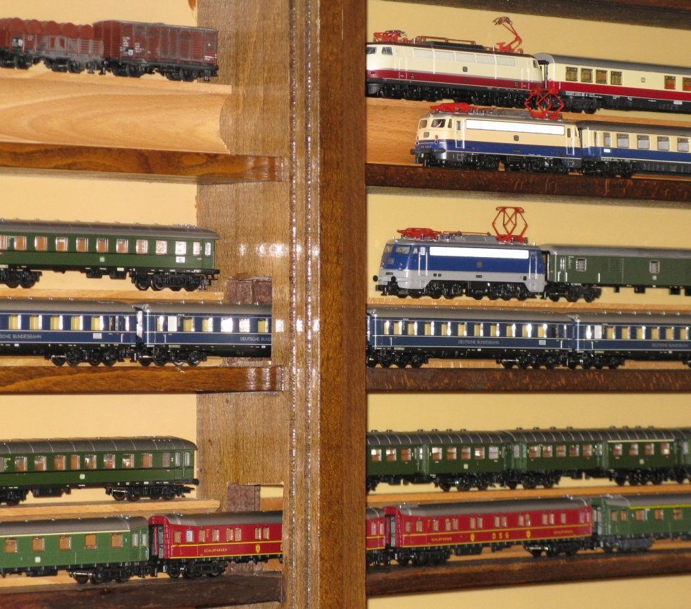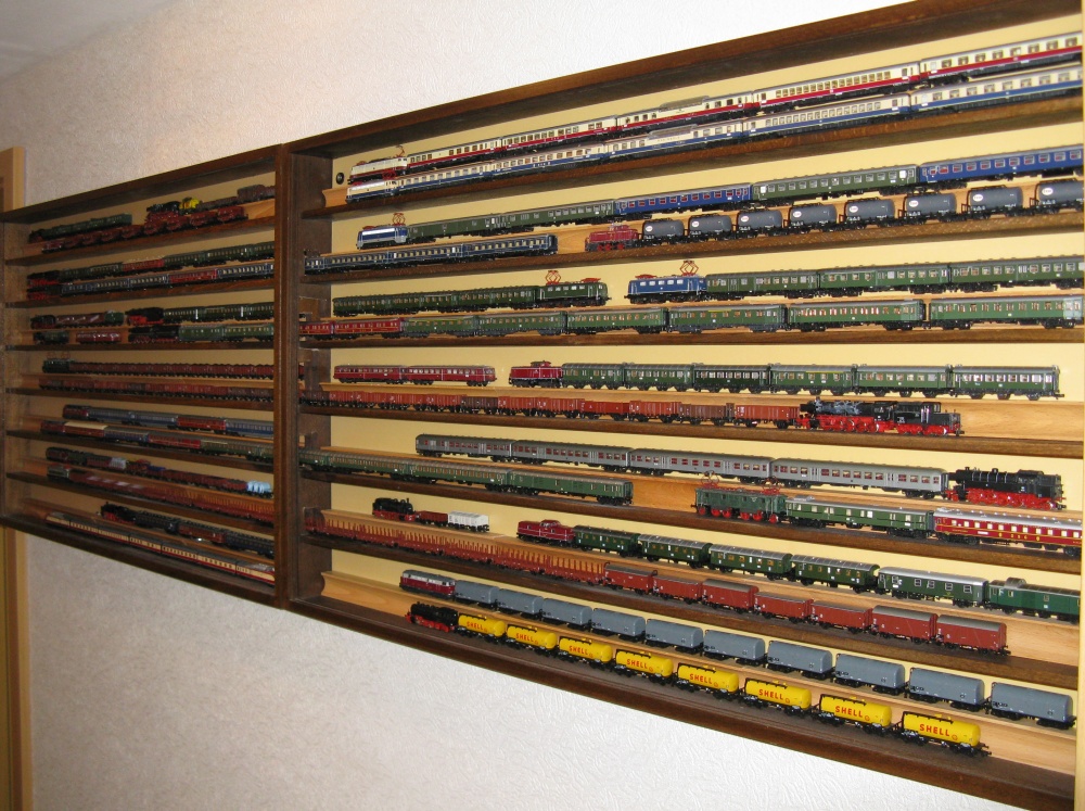 Ich habe ganz gute Erfahrungen mit den großen KIBRI-Vitrinen gemacht (12010): Mit 21 N-Hölzern macht das 14 Fächer zu je einem Meter. Ich habe jeweils zwei nebeneinander und dort, wo sie zusammenkommen, jeweils 5 Fächer aufgesägt, so dass ich Züge mit maximal 11x165mm Wagen reinbekomme. Sieht ganz gut aus.