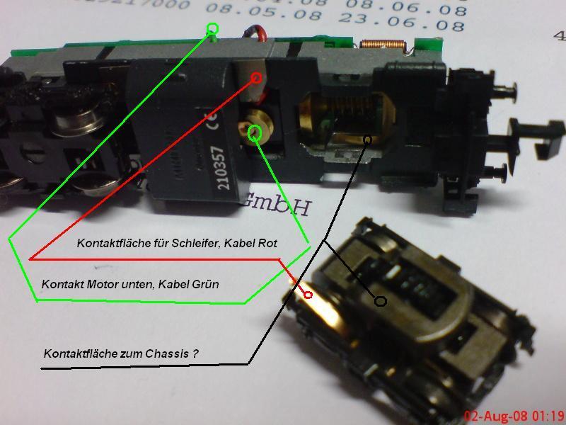 Hier noch ein Foto vom Drehgestell und Chassis. Drehgestellkontakplättchen, geht an die Kontaktfläche unter dem Chassis, wo der rote Kabelansatz zu sehen ist.