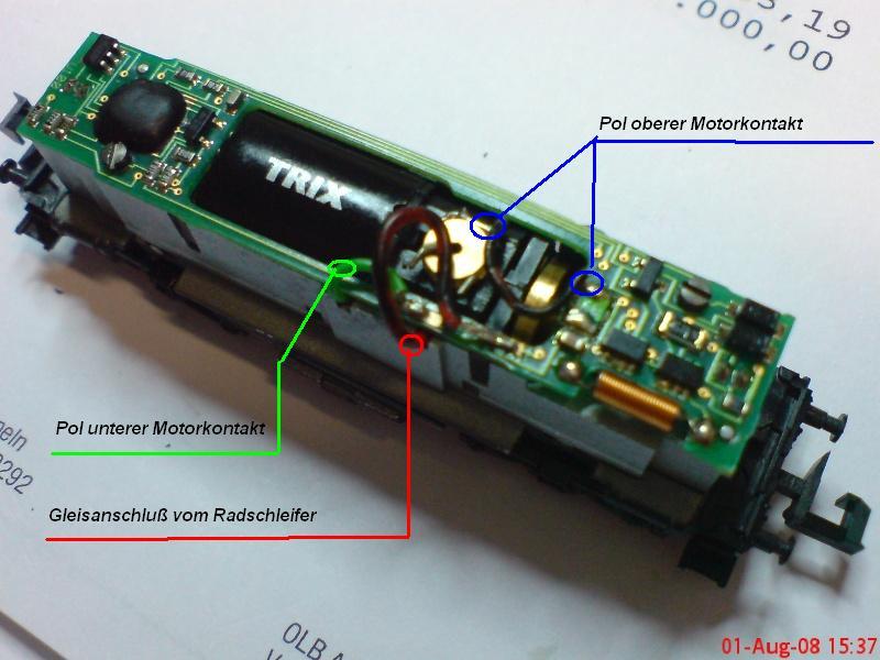 Hm, ich meinte eher, mal durchzumessen, ob die Kabel jeweils Verbindung rechts und links zum Gleis haben. Die Platine sieht aber eher so aus, als würde eine Gleisseite direkt mit dem Chassis verbunden sein und das rote Kabel die andere Gleisseite nach oben verbindet.
