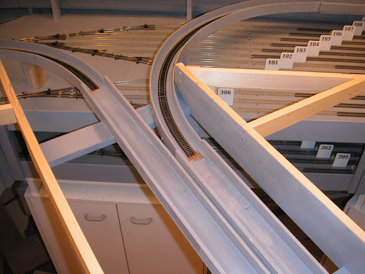 Ich habe es ähnlich gemacht. Dünne Pappe, etwa so stark wie die Rücken von Schreibblöcken, in 2cm Streifen geschnitten und mit Weissleim an die Trassen angeklebt. Der Überstand beträgt ca. 10mm, so das ich noch Wagen und Loks aufs Gleis setzen kann, falls nötig.