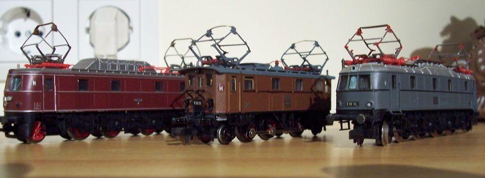 Von links: E 19 11 von Arnold mit Sommerfeld-Stromabnehmern, daneben die GFN E 32 mit überarbeiteten BRAWA-Stromabnehmern und daneben die E18 von Arnold mit BRAWA-Stromabnehmern.