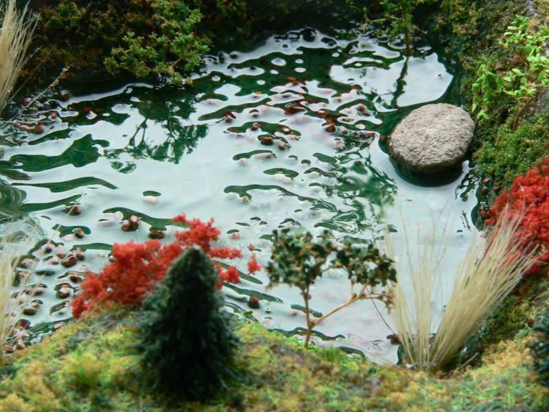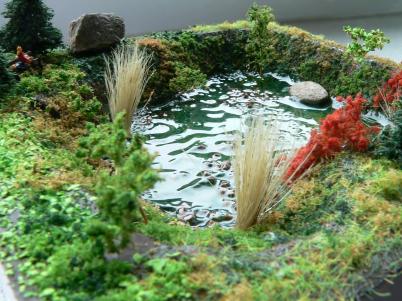 Habe mir zwei kleine Styrodor Reste genommen und daraus einen kleinen Tümpel ausgeschnitten. Die Ufer sind etwas zu hoch geworden leider aber das weiß man dann schon mal für das nächste mal. Als Grundlage habe ich unten ein Wasser-Leim Gemisch genommen und darauf dann mehrere Lagen Zewa gelegt und ordentlich eingestrichen mit dem Gemisch. Mit dem Pinsel kann man gut die feuchte Zewa etwas stauchen damit das ganze so ähnlich wie kleinen Wellen aussieht. Nach einem Tag trocknen habe ich mit einfacher Disperionsfarbe den Grund mit grün,grau Tönen bemalt und das Ufer/Umgebung mit braun und ocker Tönen versehen. Auf die noch nasse Farbe vom Tümpel hab ich ein paar Korkreste zerbröselt sowie Bürsten Haare geklebt die ein bisschen Schilf darstellen sollen. Danach wieder trocknen lassen. Dann mit Wasser/Leim Gemisch Ufer und Umgebung eingestrichen und mit Flock, Rasen,Laub belegt. Ein paar gebastelte kleine Bäumchen aus Seemoos ans Ufer gesteckt damit es nicht ganz so leer aussieht und ein paar Tannen gesteckt. Nach abtrocknen des ganzen dann zum Schluss den Tümpel selbst mit dick Lack gestrichen.