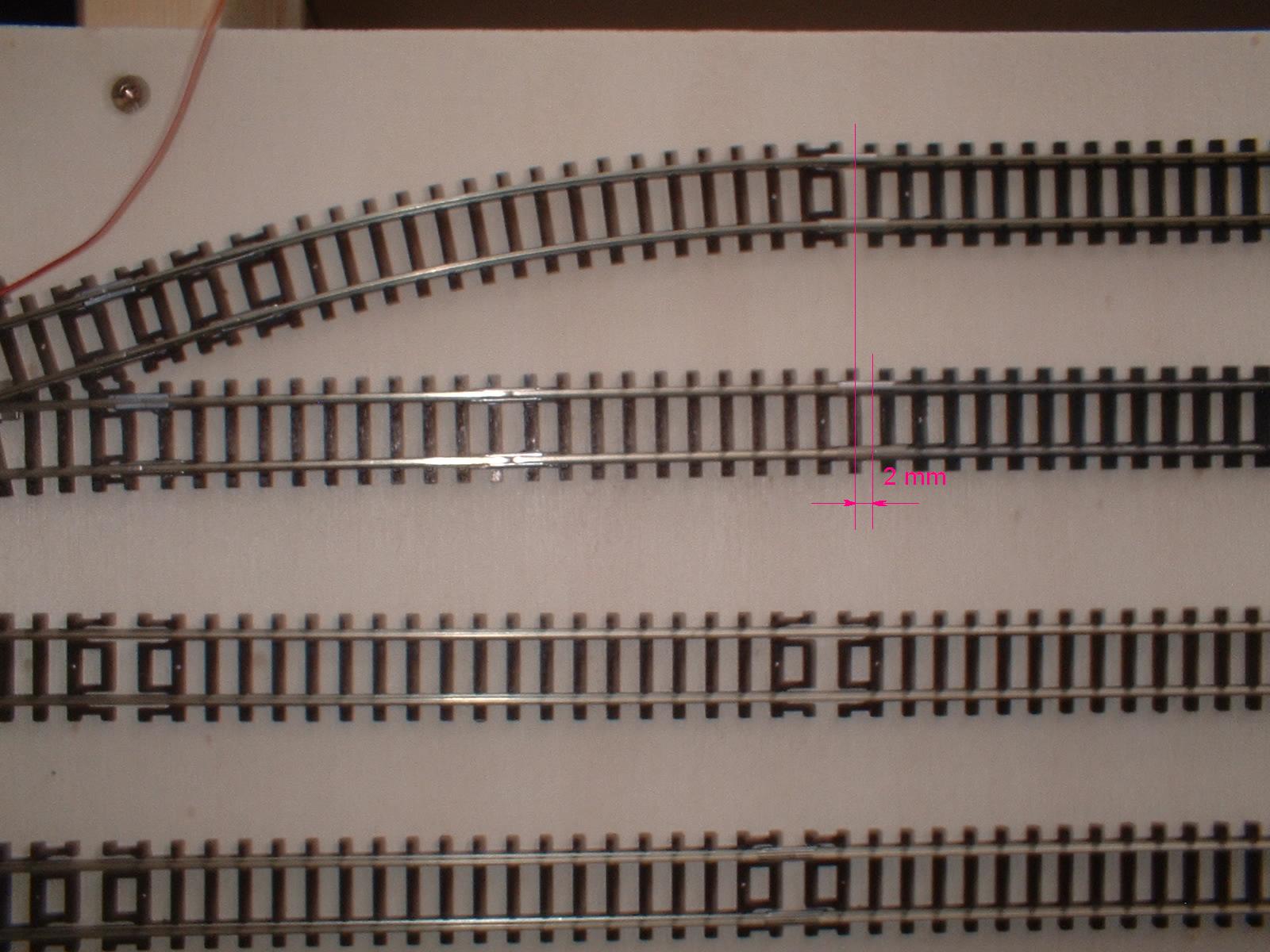 Von einer rechts Weiche aus an dem gebogenen Stück 2 x 22204, an dem geraden Stück der Weiche 1 x 22207 und 1 x 22226. Bei der Umsetzung auf meiner Anlage stellte ich dann aber zu meiner Verwunderung einen Versatz von fast 2 mm fest, wie man auf dem Bild sieht: