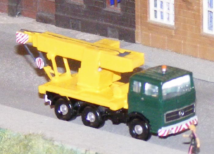 Bei mir ging ein kleiner Bergekran in den "Einsatzbestand". Das Fahrgestell ist von Wiking, der Aufbau entstand aus Kunststoffbastelplatten.