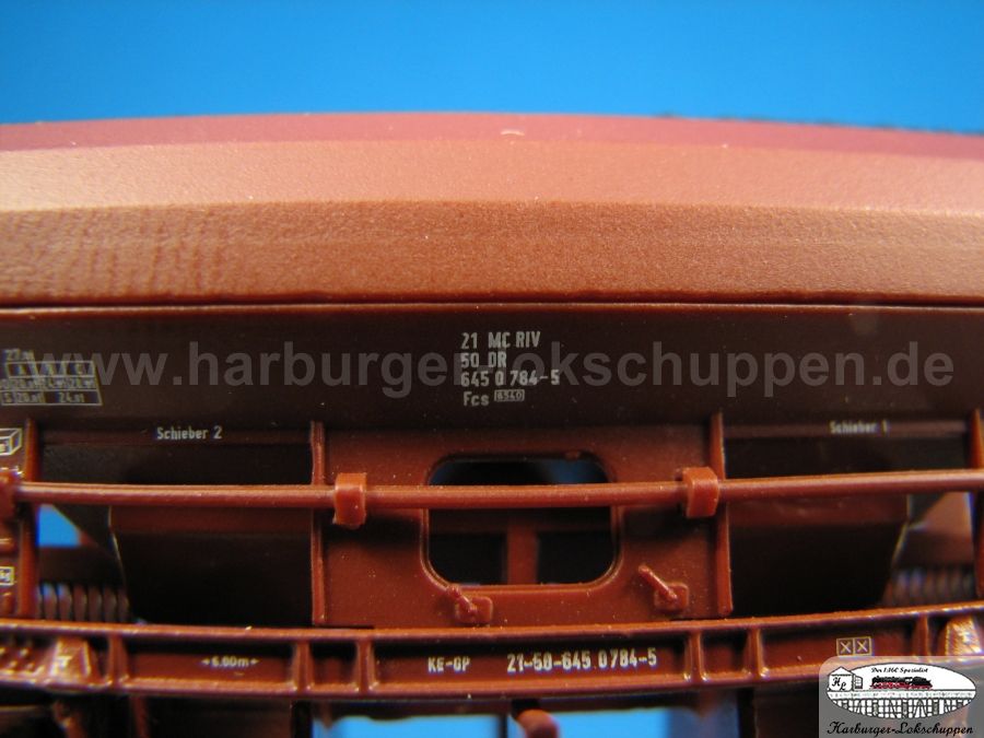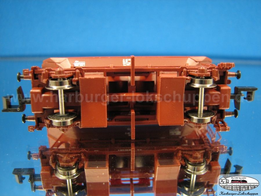 Der Waggon hat wieder mal keine Kurzkupplungskinematik. Beladen ist der Waggon mit einer Kohlenladung (herausnehmbar). Da dieser Waggon eine funktionierende Entlade Schiebemechanik besitz, kann er also mit Schüttgut beladen werden.