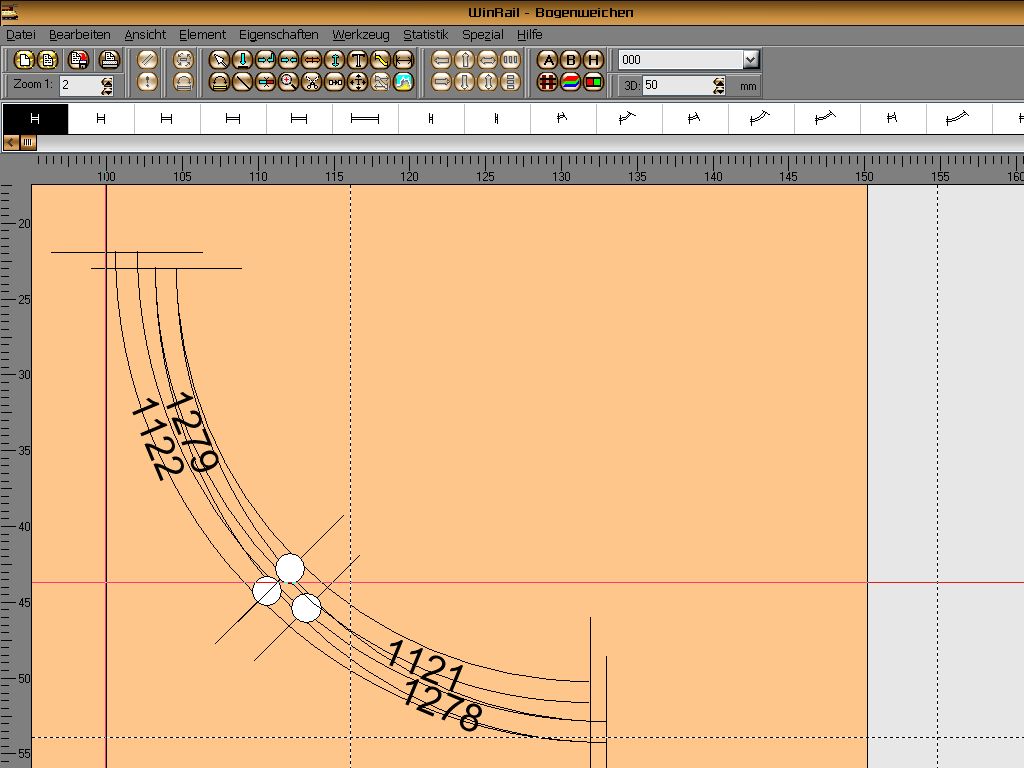 Diese ungefähre Übereinstimmung der Radien bei der Bogenweiche verkaufen sie dann als der Außenradius Rx und den Innenradius Ry aus dem Programm der normalen gebogenen Schienen.