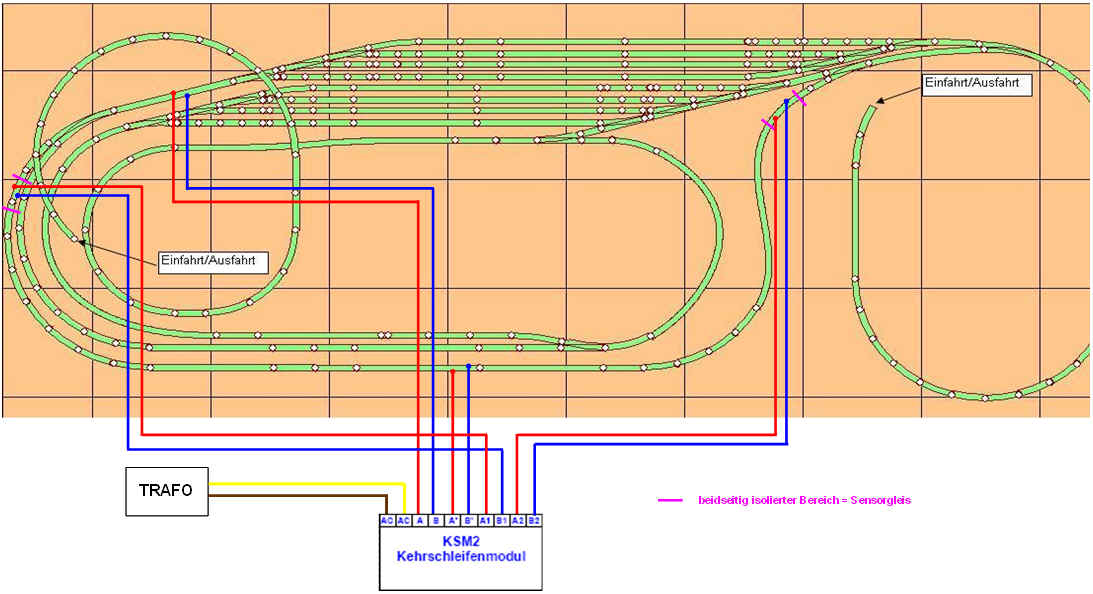 ich wende mich mit meinem Problem an all diejenigen, die Erfahrungen mit dem Kehrschleifenmodul von MÜT gemacht haben. Das KSM2 versorge ich extern über einen Trafo. Ich habe die Kehrschleife in meinem Schattenbahnhof so angeschlossen, wie im Bild (Link) dargestellt.