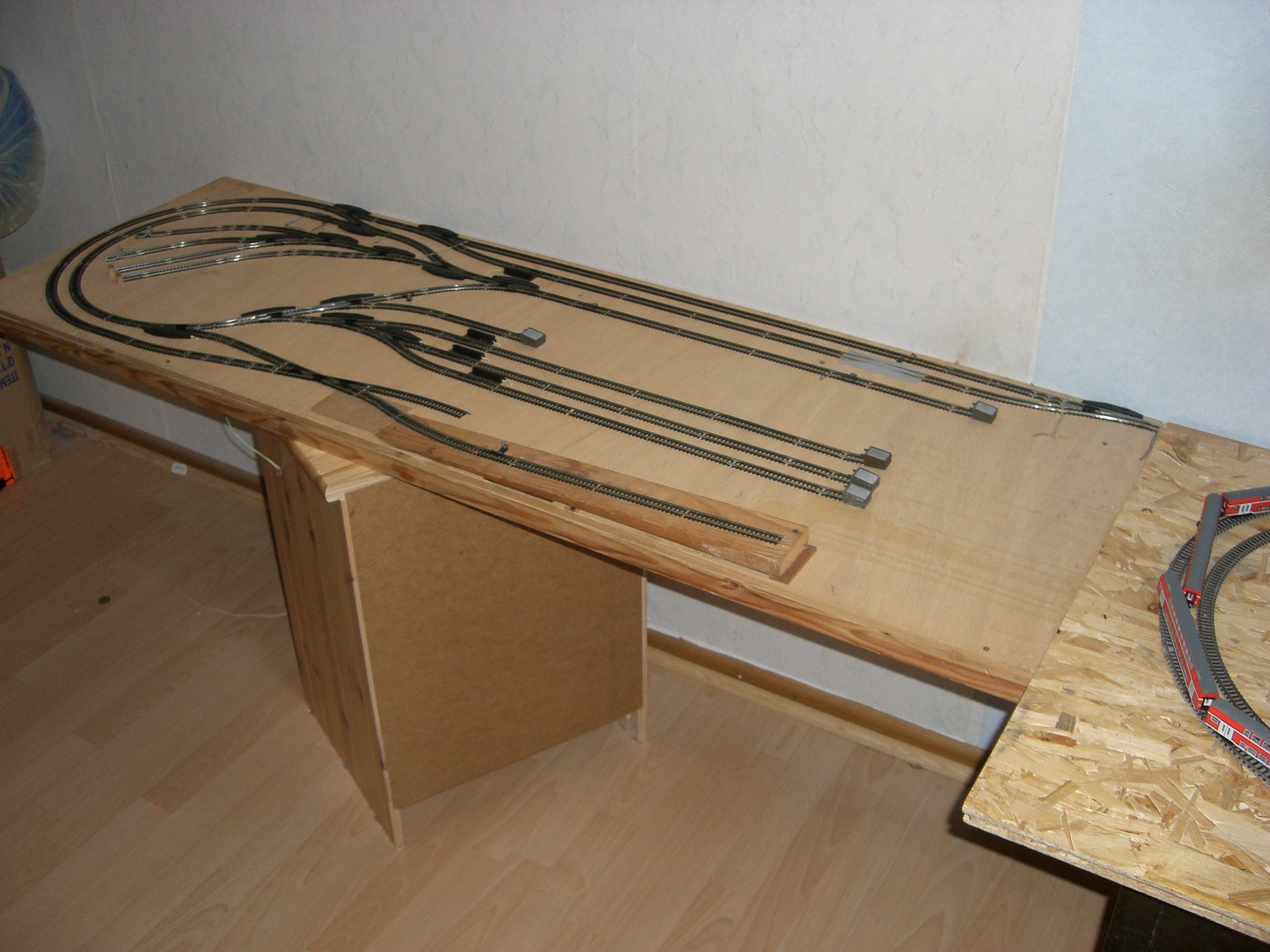 Auch wenn du an den Gleisplan keine großen Ansprüche stellst, würde ich wie Georg anregen, über einen kleinen Schattenbahnhof nachzudenken. Deine Fläche ist ausreichend groß dafür und du hast die Möglichkeit in weiteren Mobabasteleien zu probieren