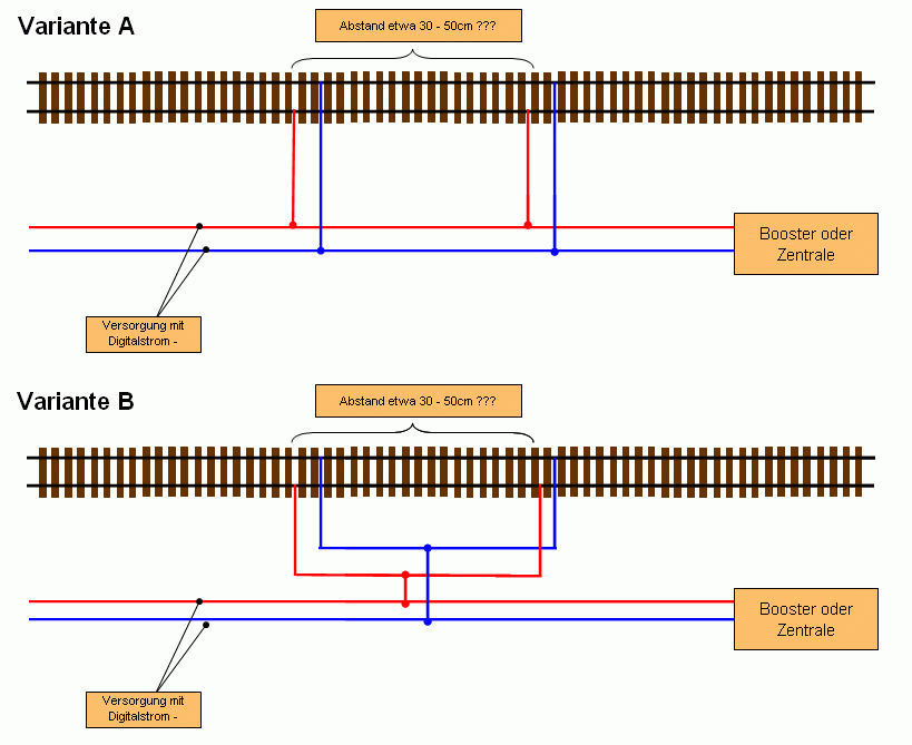 Würde auch Variante B funktionieren, d.h. ich führe alle Anschlüsse eines Gleisabschnittes zusammen und gehe erst von da an die Ringleitung? Und ist der Abstand 30-50cm zu empfehlen oder kann er auch größer gewählt werden?