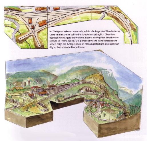 Um viele Steigungen zu vermeiden, liegt das "doppelte Riesenoval auf der einen Ebene, der Kopfbahnhof und das BW auf der Ebene darüber.