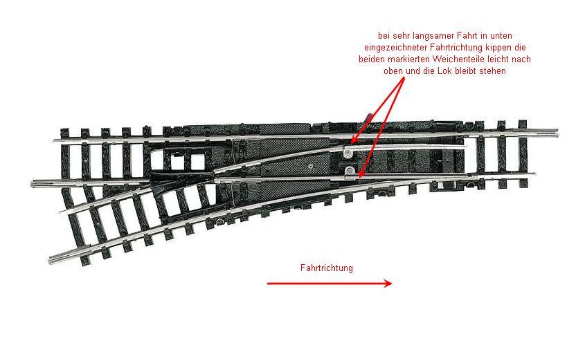 Mein Problem ist in dem Zusammenhang mit den Minitrixweichen nicht der elektr. Kontakt. Die Lok bleibt durch das "Kippen" bei sehr langsamer Fahrt einfach hängen.