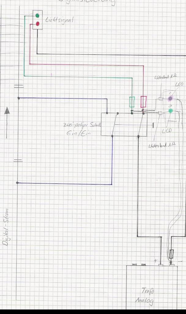 Hmmm, wird ein wenig zu komplex. Wir starten mit Roco und DCC. Weichen werden extern über Tastschalter im Tableau ( mit entsprchenden LED´s ) geschaltet. Lichtsignale will ich eigentlich idem extern versorgen, nur die Gleisschaltung sagt mir garnix. Signale brauchen ja eigentlich nur einen simplen on - on schalter, der über einen dritten fuss mit energie versorgt wird. Das ist so wie bei den Weichen. Nur, wie kriege ich die Spannung auf´s Gleis, und wie schalte ich sie wieder aus ? das will ich auch mit einem Schalter machen. In einem Schattenbahnhof macht ein ruckartiges stillstehen eh nix aus. Und auf der Sichtbahn müssen wir sehen wie wir die Kiste sanft vor´s Signal setzen.