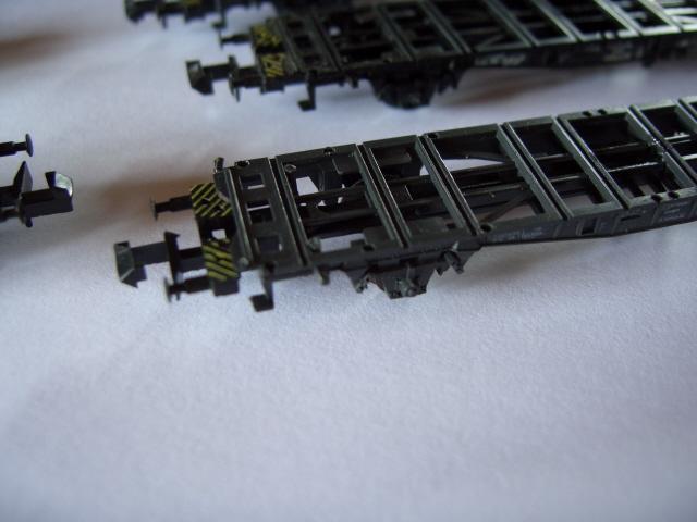 Bei den 3 GFN-Sgns/Sgss-y, die ich vor einigen Jahren in Unwissenheit gekauft habe, habe ich daher - um Austauschcontainer aufsetzen zu können - die bizarren Haltenippel entfernt. Jetzt passen MTX/Arnold/Walthers Container ohne Probleme in die Aufnahmen für die Zapfen der Container und ich kann die Waggons vorbildlich beladen fahren.