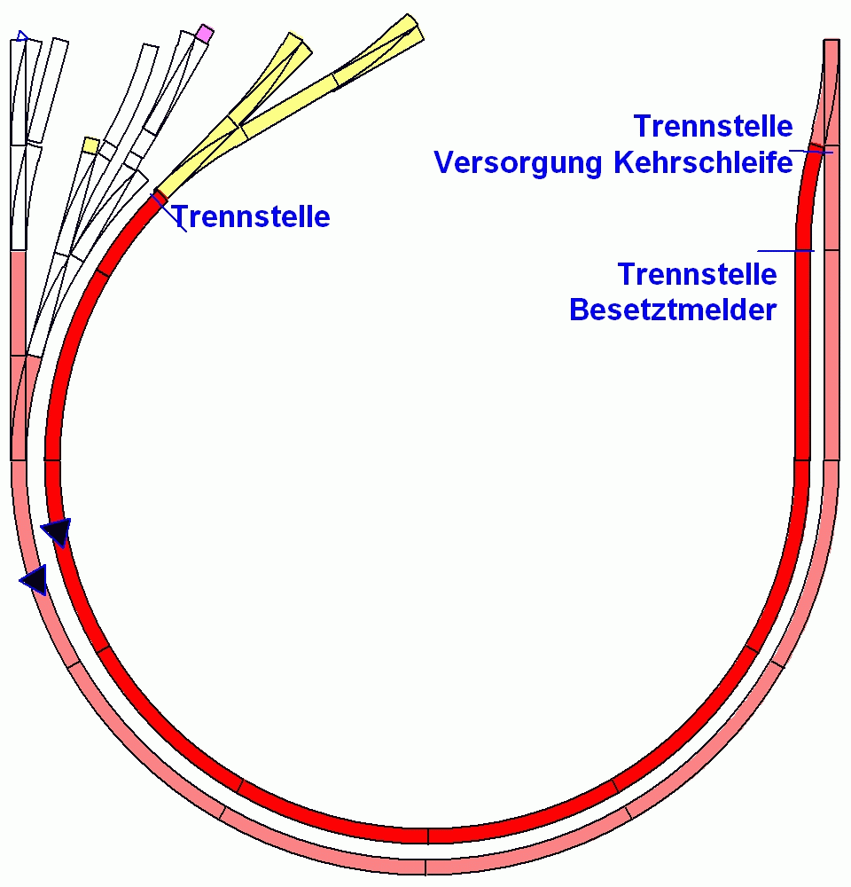 Die stromlosen Abschnitte verhindern nun die Anforderung der Wagenachsen einer Polung. Die Kehre braucht nun nur so lang sein, wie eine Lok. Bei beleuchteten Wagen klappt es aber nicht mehr, da hilft nur eine Kehre, die eben länger ist, als der längste Zug.